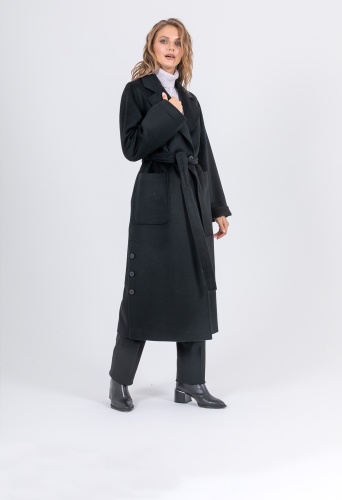 На сайте указаны российские размеры. Классическое строгое пальто из 100% шерсти. Прямой крой, английский воротник, большие наружные карманы, на пуговицах и поясе. Украшена модель тремя дополнительными пуговицами внизу вдоль бокового шва с 2-х сторон пальто. Рост модели: 174 см