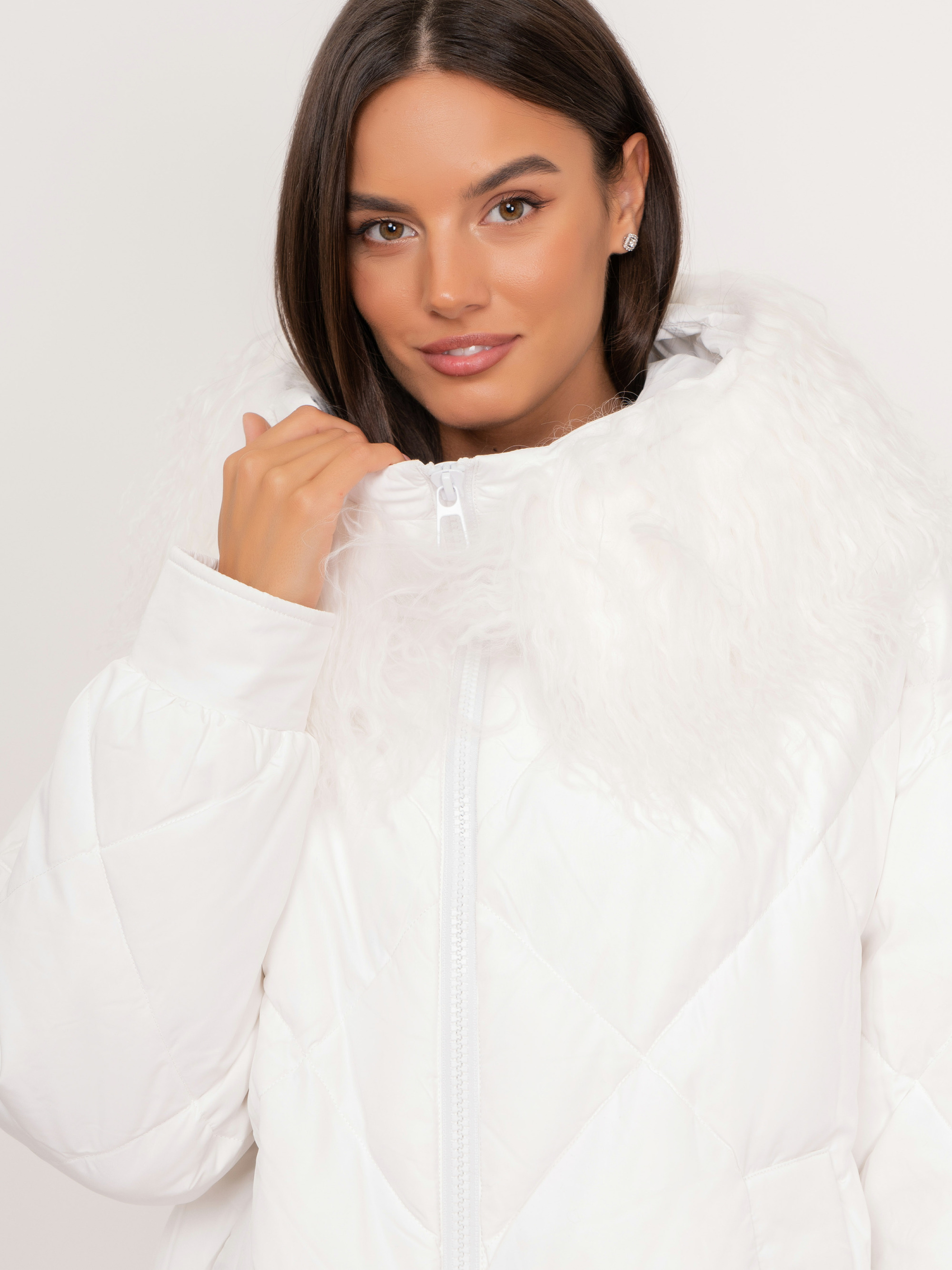На сайте указаны российские размеры. Полуприталенная пуховая белая куртка на молнии, с капюшоном, со съемной опушкой из 100% натурального меха ламы, с длинными рукавами на кнопках, с прорезными карманами на кнопках. Рост модели: 175 см. Длина по спинке: 69 см.