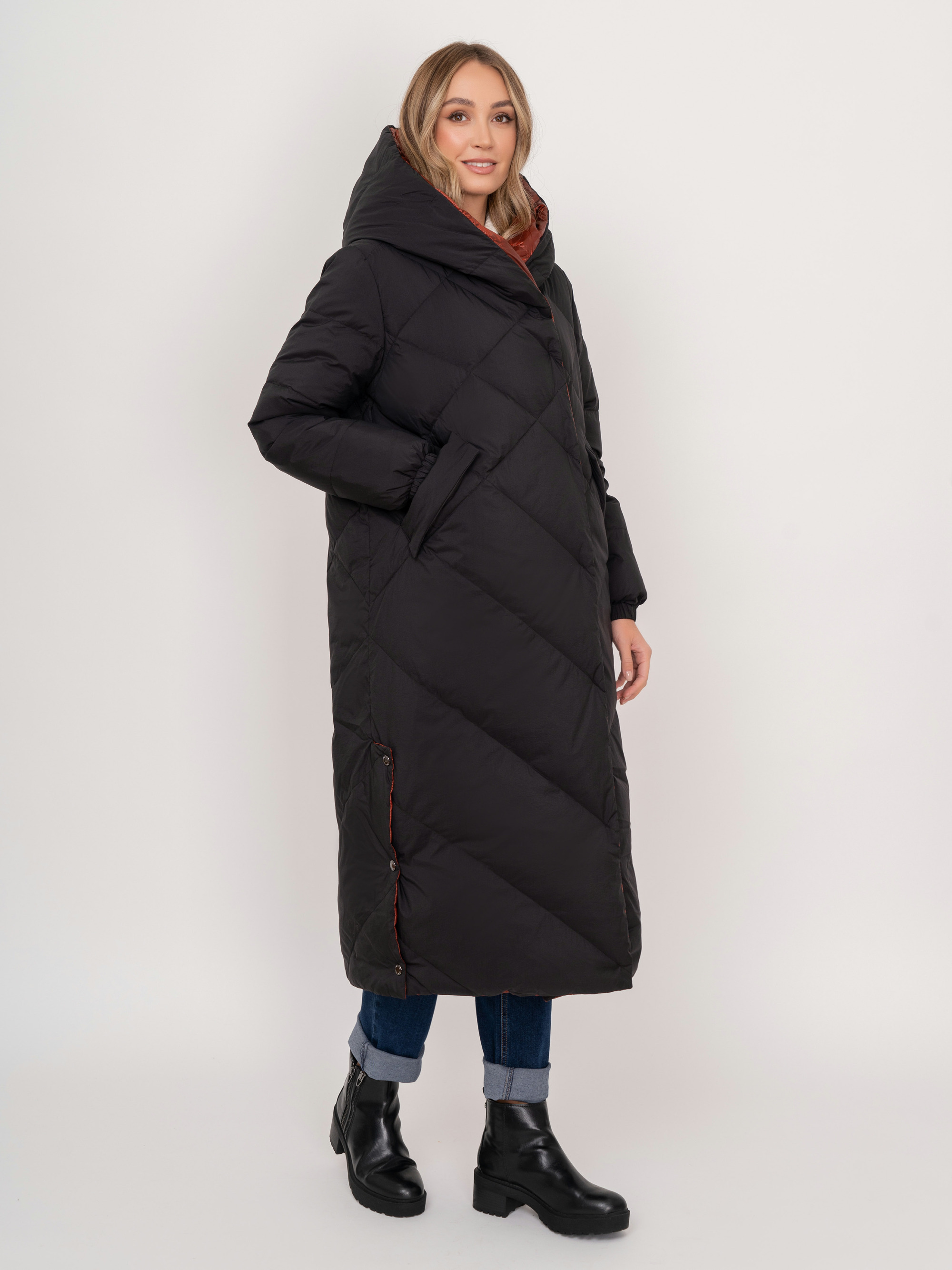 На сайте указаны российские размеры. Двустороннее утепленное черно-терракотовое пальто на молнии и кнопках, с длинным рукавом, с прорезными карманами, с трикотажными манжетами, с боковыми разрезами на кнопках. Рост модели: 175 см. Длина пальто: 119 см.