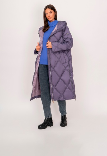 На сайте указаны российские размеры. Прямое стеганое утепленное фиолетовое пальто на молнии, с капюшоном, с длинным рукавом, с прорезными карманами на кнопках. Рост модели: 175 см. Длина куртки: 114 см.
