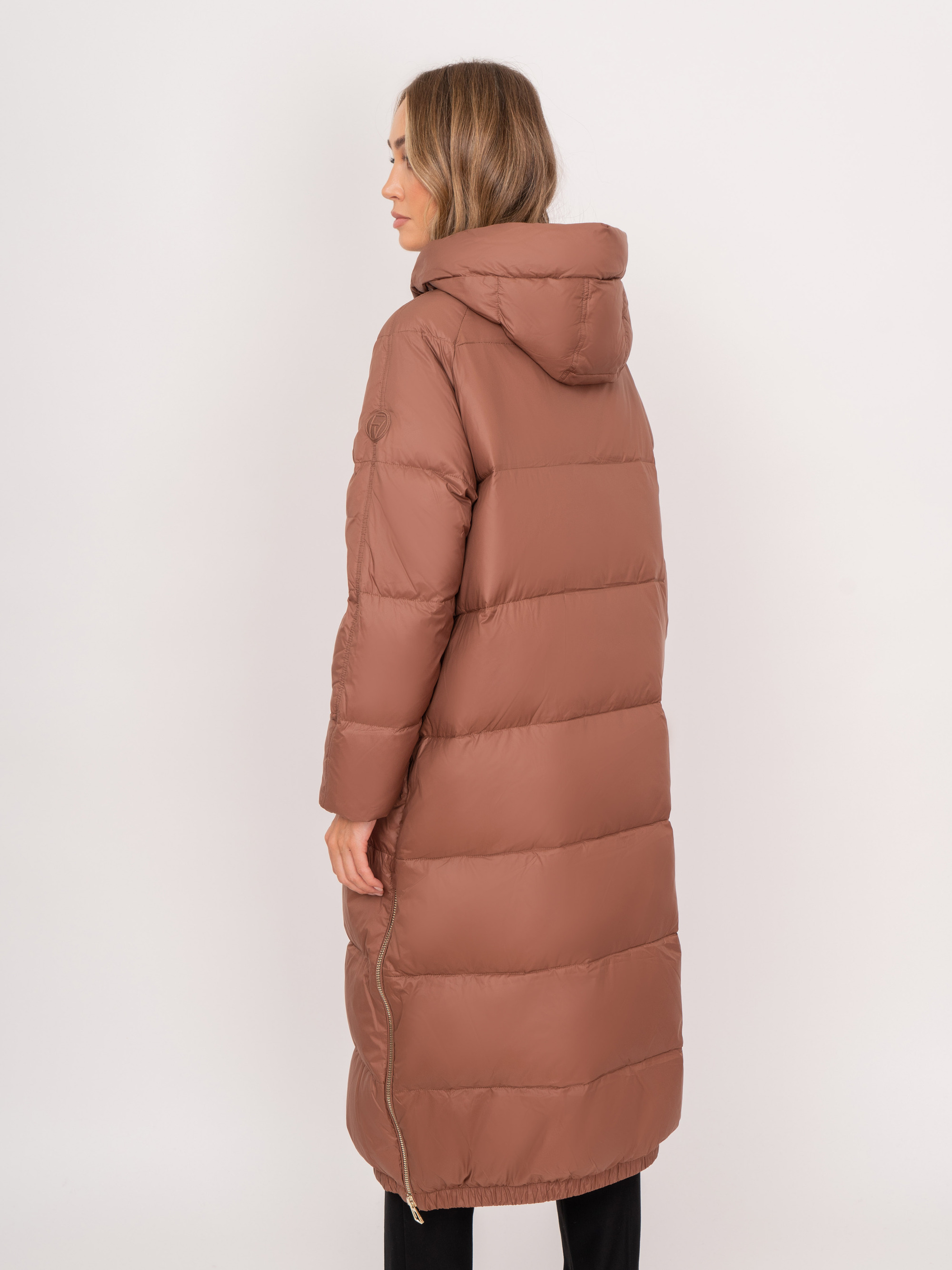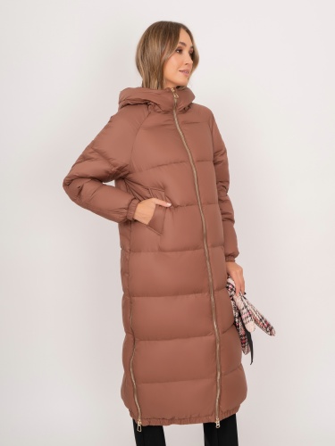 На сайте указаны российские размеры. Прямое утепленное пальто на молнии, с капюшоном, с прорезными карманами, с боковыми разрезами на молнии. В комплект входит дутый теплый бежевый шарф и варежки из плащевой ткани в яркую клетку. Длина по спинке: 115 см. Рост модели: 175 см.