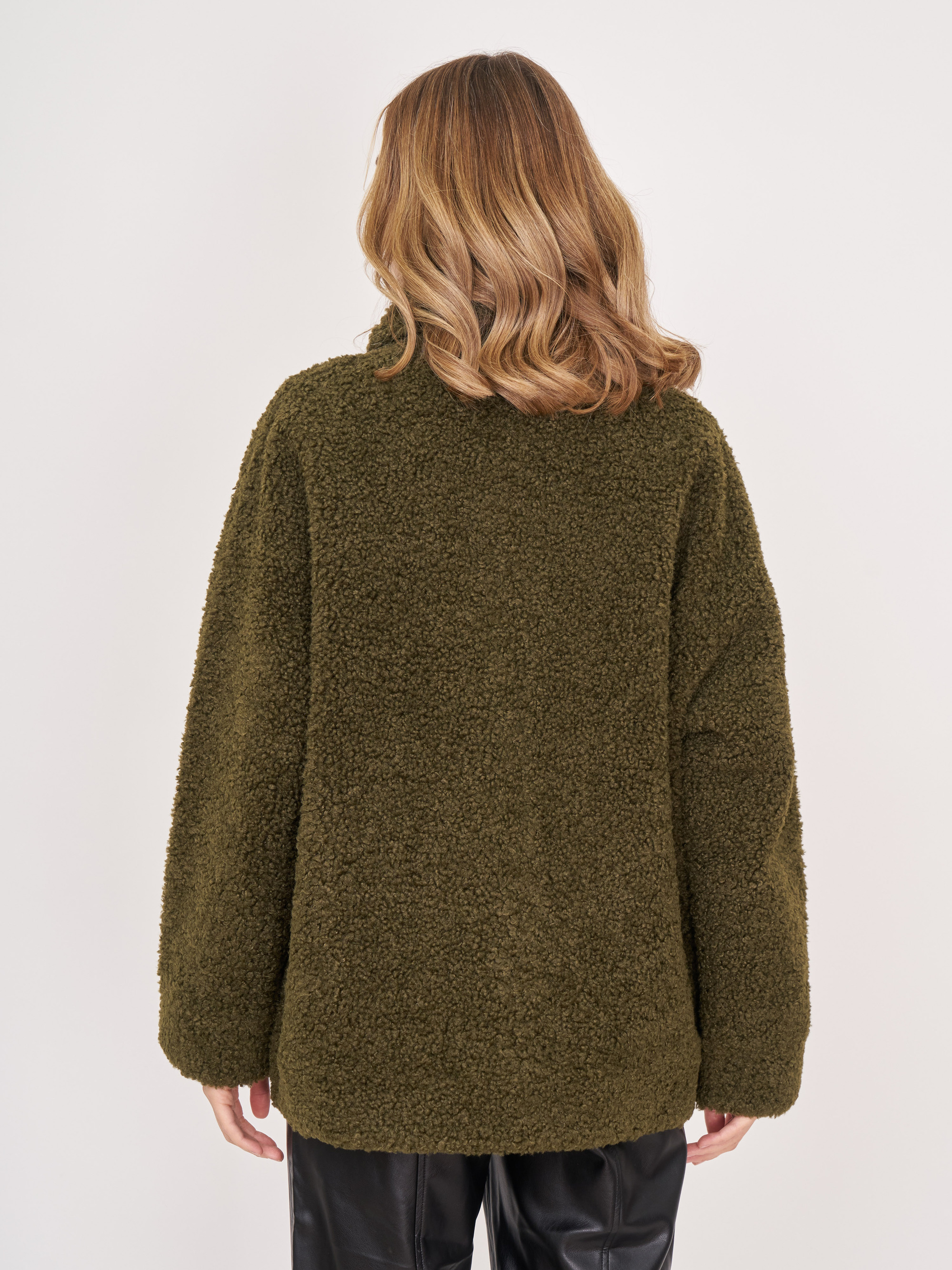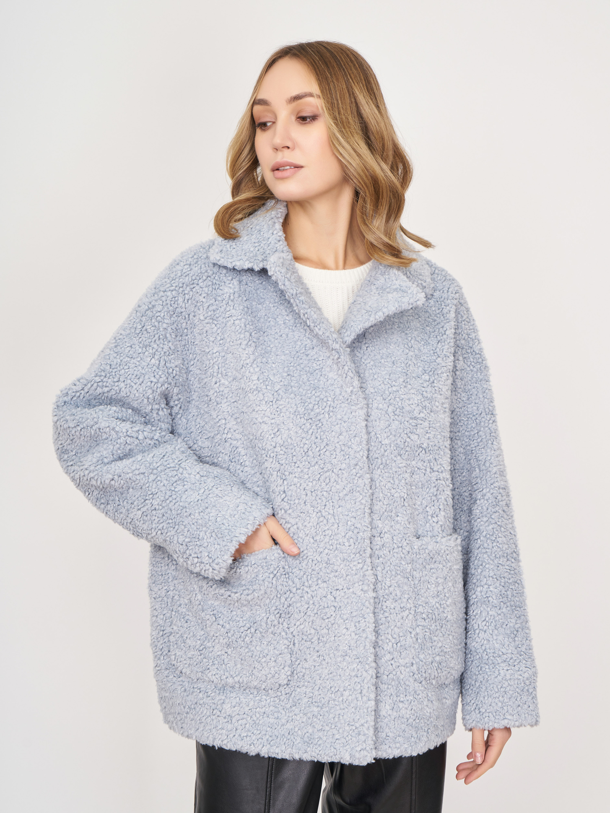 На сайте указаны российские размеры. Прямая двусторонная куртка из искусственного меха на кнопках, с отложным воротником, накладными карманами и с длинным рукавом. Представлена в голубом и хаки цветах. Длина по спинке: 70 см Рост модели: 175 см