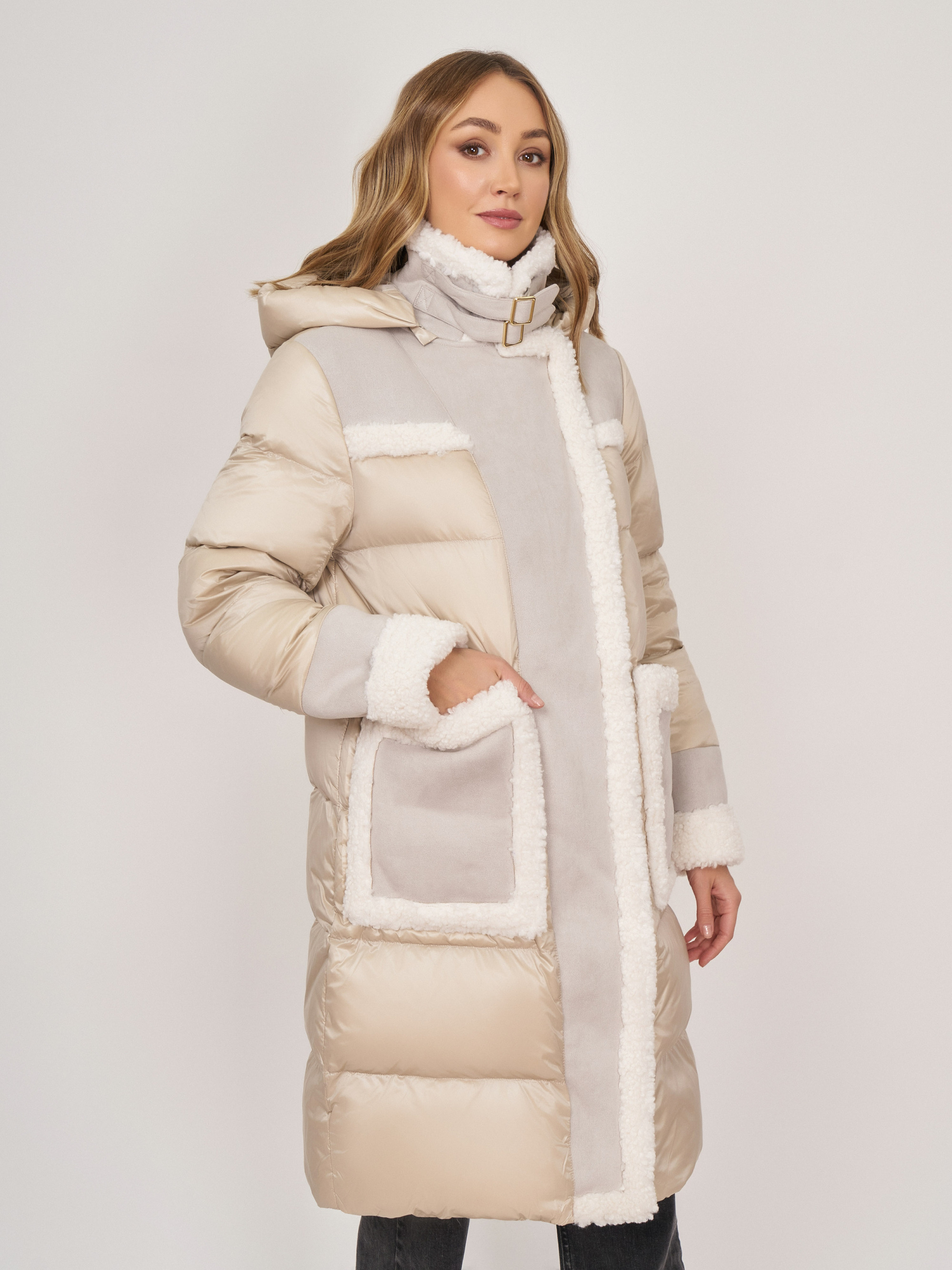 На сайте указаны российские размеры. Прямое утепленное светло-бежевое пальто на молнии, с воротником-стойка, со съемным капюшоном, с длинным рукавом, с накладными карманами. Дизайн дополнен серой замшей и белым искусственным мехом. Длина по спинке: 97 см. Рост модели: 175 см.