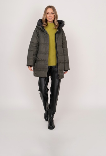 На сайте указаны российские размеры. Утепленная прямая хаки куртка на молнии и кнопках, с капюшоном, с прорезными карманами, с вышивкой. Длина по спинке: 79 см. Рост модели: 175 см.