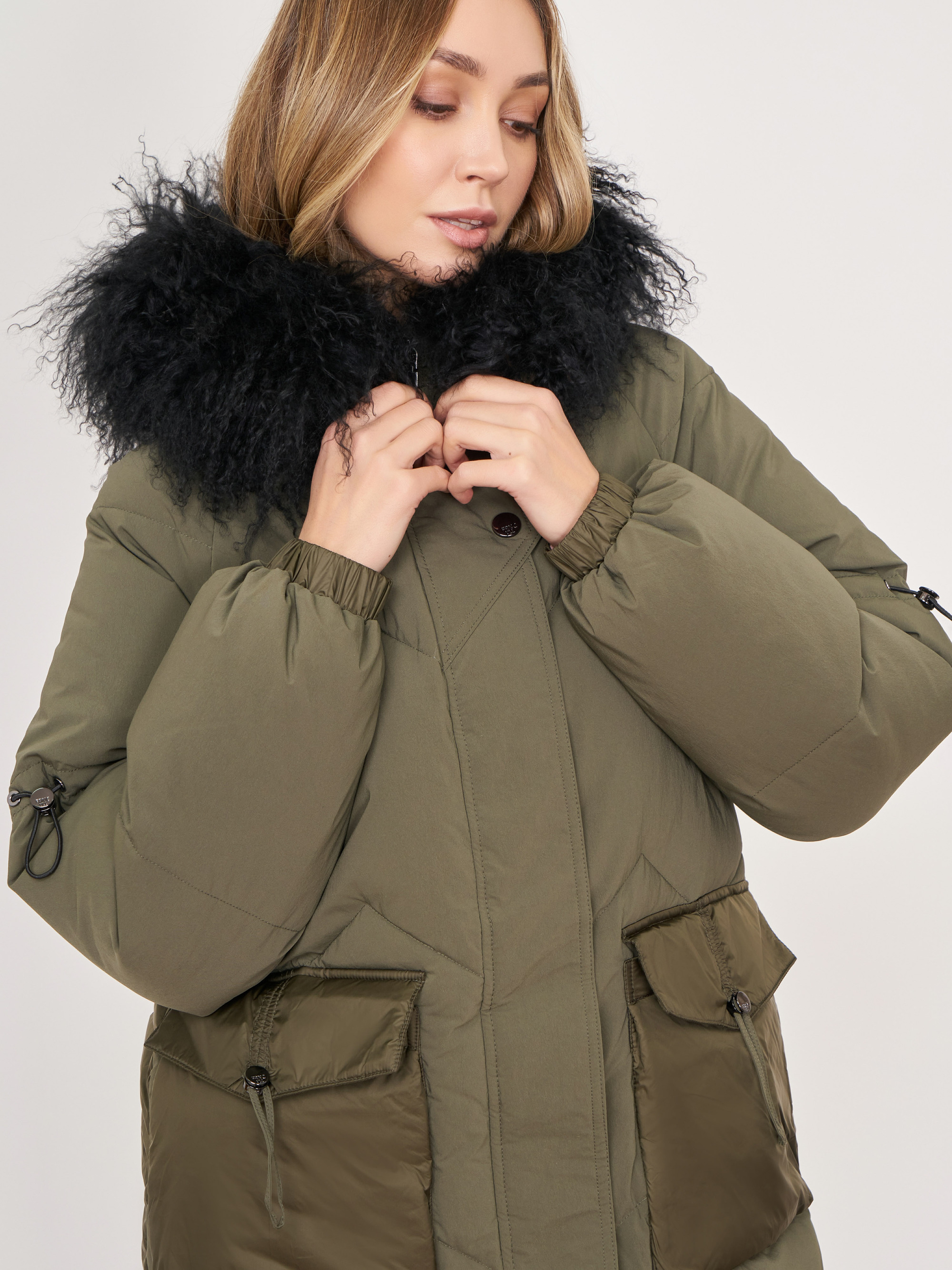 На сайте указаны российские размеры. Прямое утепленное хаки пальто на молнии и кнопках, с несъемным капюшоном, со съемной опушкой, с длинным рукавом с кулиской, с накладными карманами. Длина по спинке: 99 см. Рост модели: 175 см.