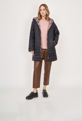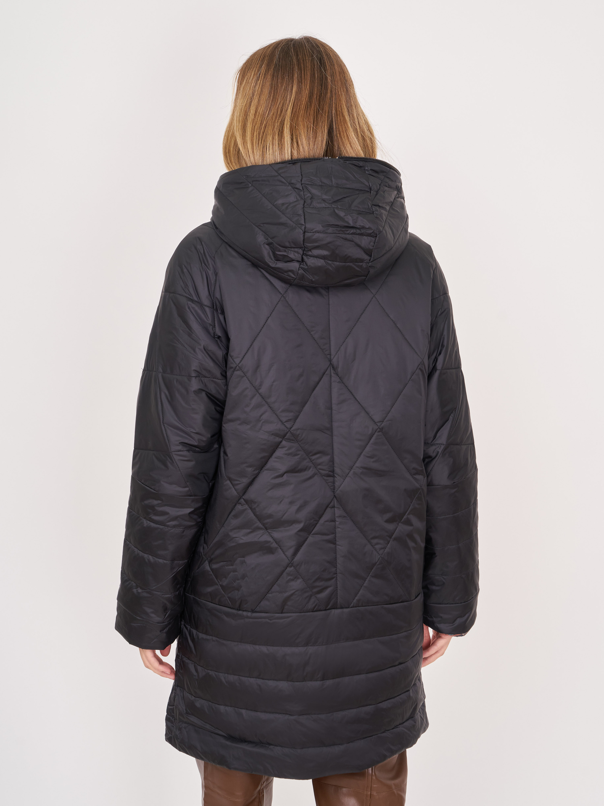 На сайте указаны российские размеры. Прямое стеганное черное утепленное пальто на молнии, с воротником-капюшоном, с длинным рукавом, с прорезными карманами на магнитной застежке. Длина по спинке: 85 см. Рост модели: 175 см.