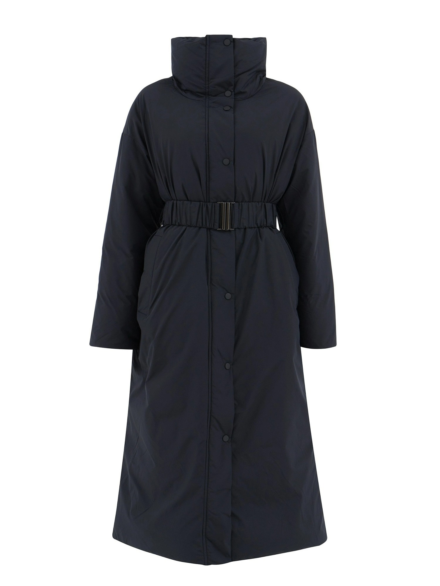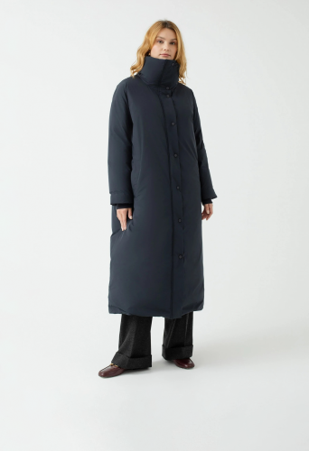 На сайте указаны российские размеры. Утепленное пальто прямого силуэта из плащевой ткани темно-синего цвета. Пальто произведено из премиальной плащевой ткани. В качестве утеплителя 90% пух и 10% перо. Комфортный рубашечный рукав, высокий воротник-стойка, что позволяет не использовать дополнительные теплые аксессуары, и при этом надежно сохраняет тепло. По низу рукава вязаная манжета в цвет основной ткани для дополнительного тепла. Длина пальто миди. Застежка на молнию и ряд потайных кнопок. В качестве дополнительного декора пояс-резинка на стильную металлическую пряжку, который дает возможность подчеркнуть силуэт. Внутренняя сторона пальто со стильной стежкой, которая переходит на лицевую сторону. Рост модели на фото - 175 см. Длина изделия - 123 см.