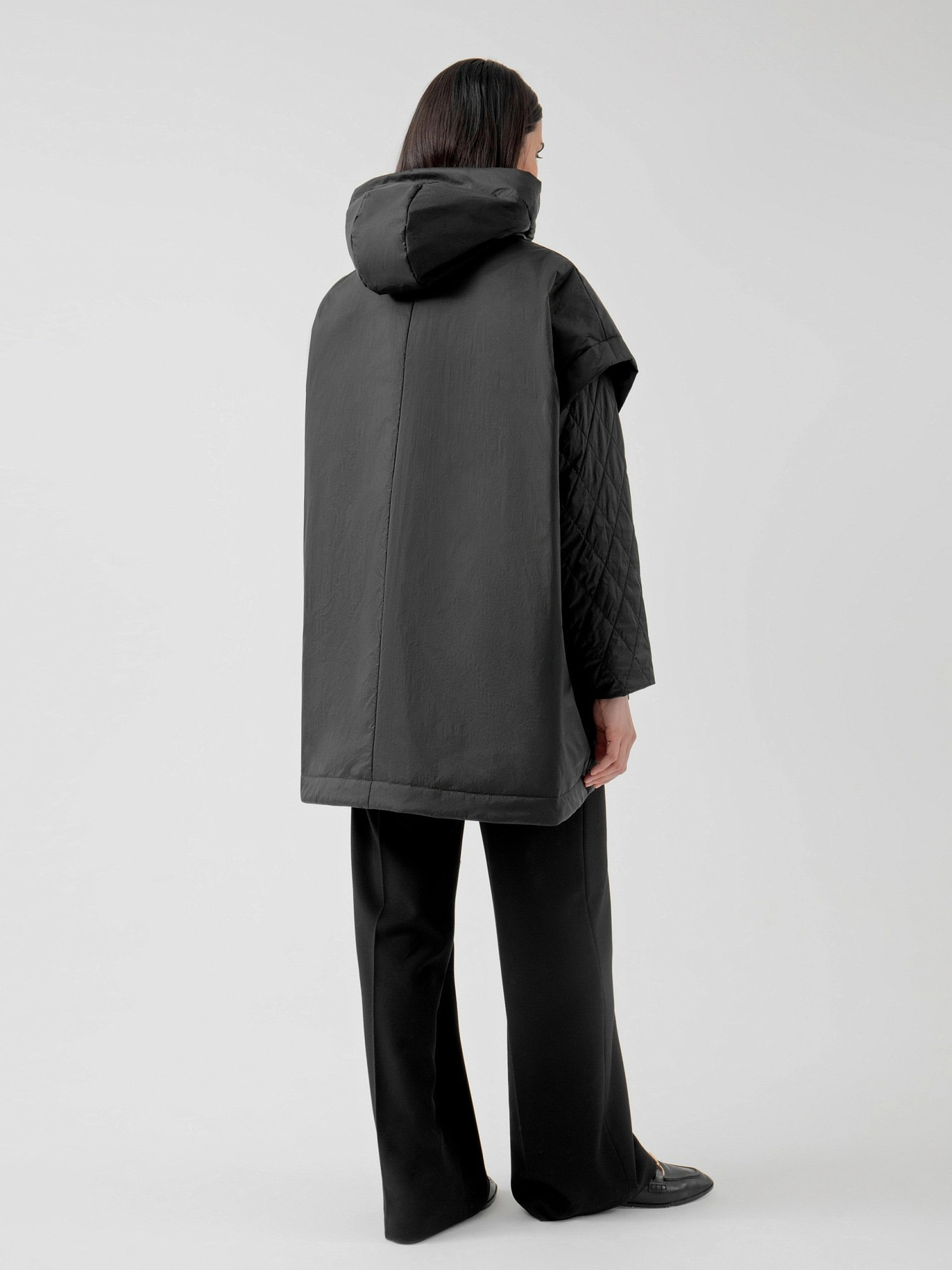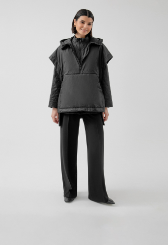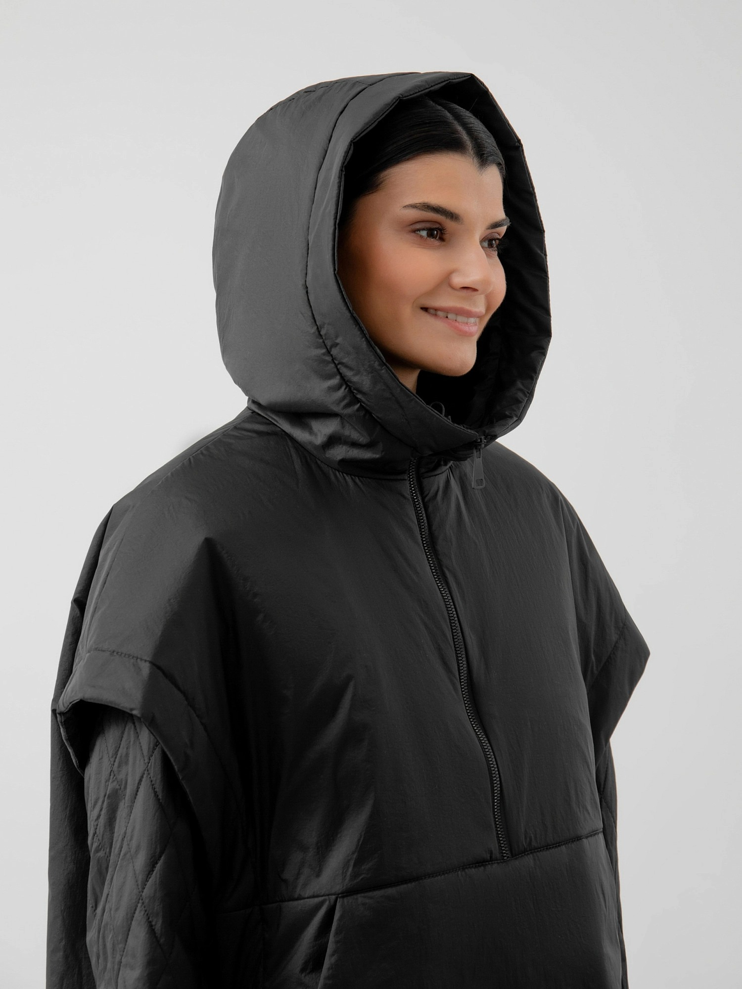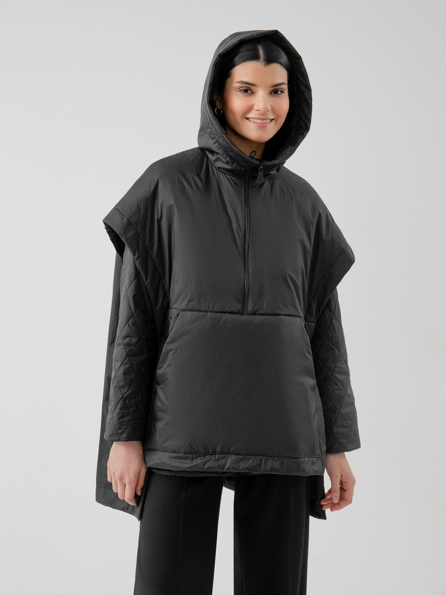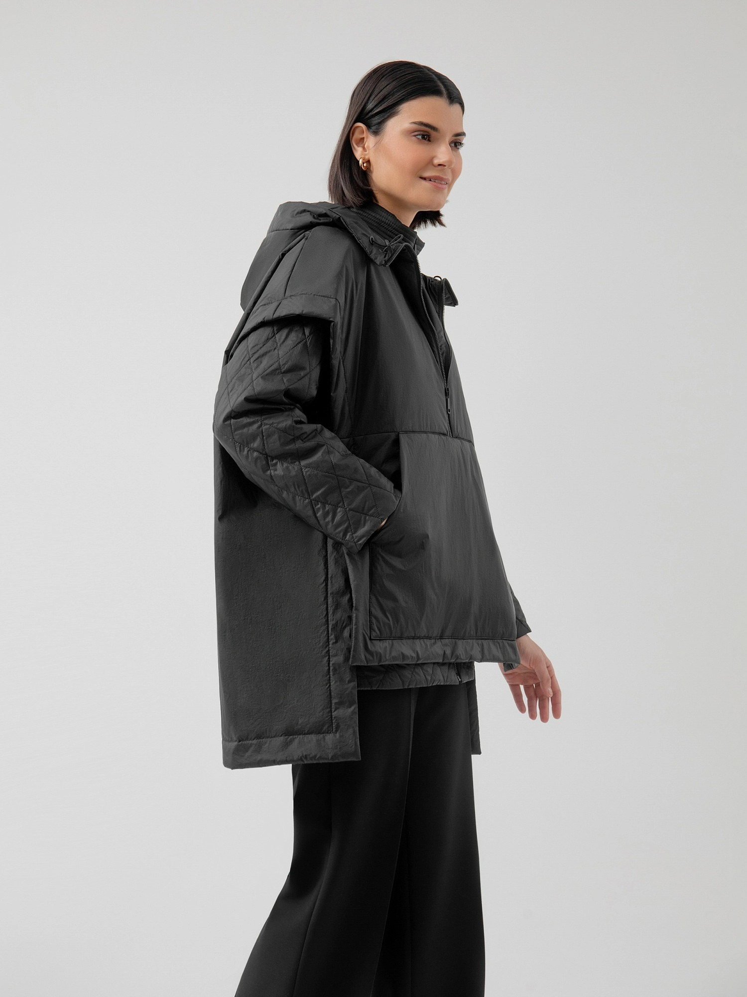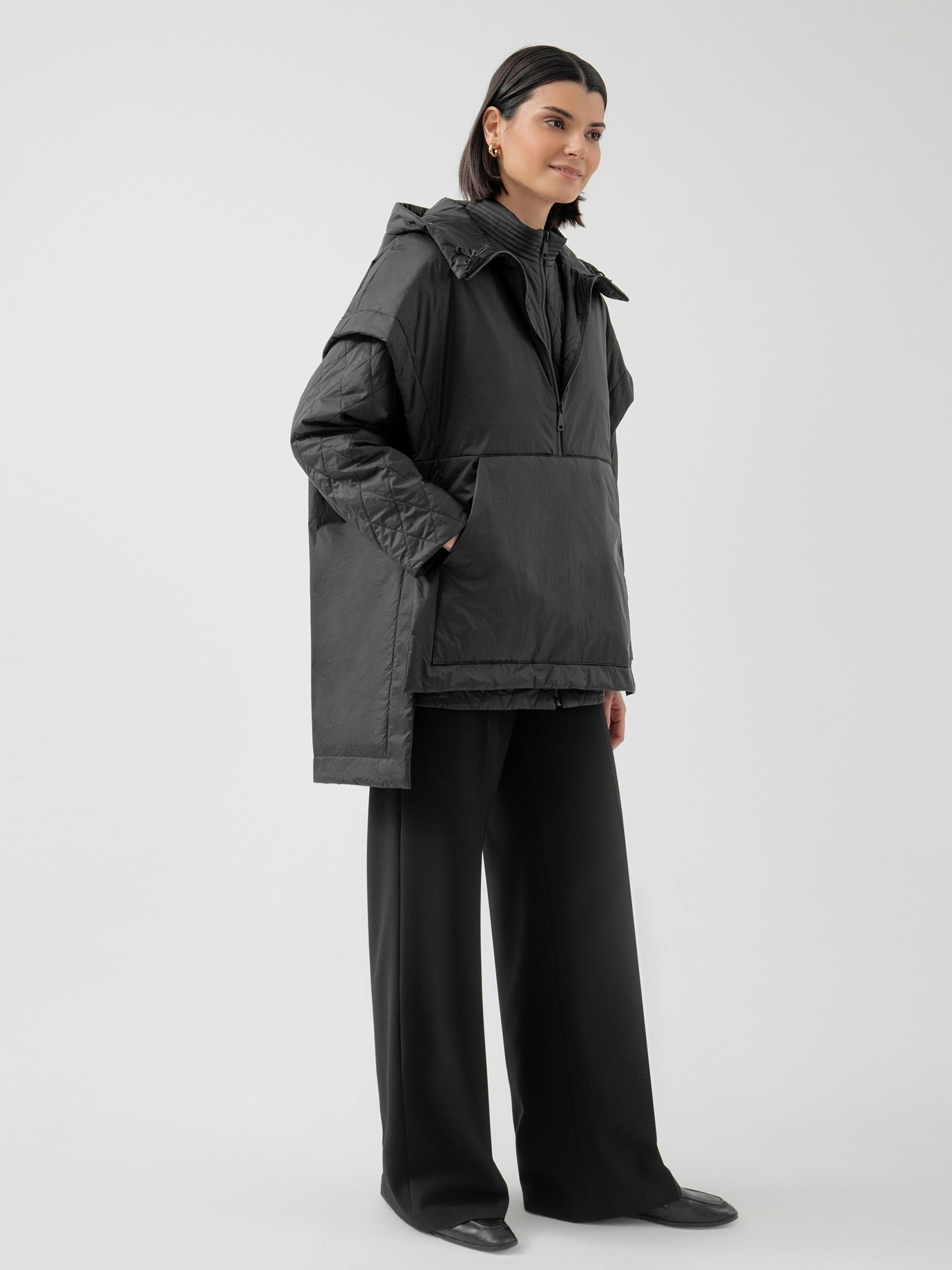 На сайте указаны российские размеры. Идеальное решение для многослойного образа в прохладное межсезонье - это наша накидка-анорак из плащевой ткани в глубоком черном цвете. Анорак станет не только стильным дополнением любого образа, но и согреет в непогоду, как ранней весной, так и прохладным летом. Внутри модели утеплитель и высокотехнологичная мембрана RaftPro, которая защитит от ветра. Горловина обрамлена глубоким и комфортным капюшоном. Анорак дает широкий спектр для создания самых различных образов, ведь надев его поверх легкой куртки или пальто, получится невероятно стильный многослойный образ. Рост модели 175 см.