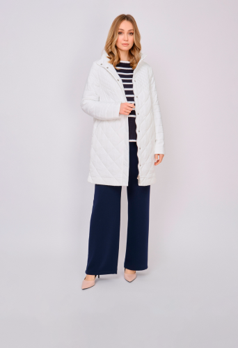 На сайте указаны российские размеры. Утепленное стеганое прямое белое полупальто на молнии, с длинным рукавом, с прорезными карманами на молнии. Длина по спинке: 90 см. Рост модели: 175 см.