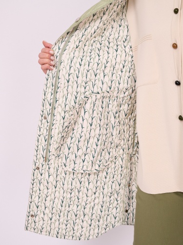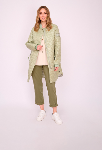 На сайте указаны российские размеры. Стеганное мятное пальто на молнии, с воротником-стойка, с длинным рукавом, с прорезными карманами на молнии, с боковыми разрезами на кнопках. Длина по спинке: 88 см. Рост модели: 175 см.