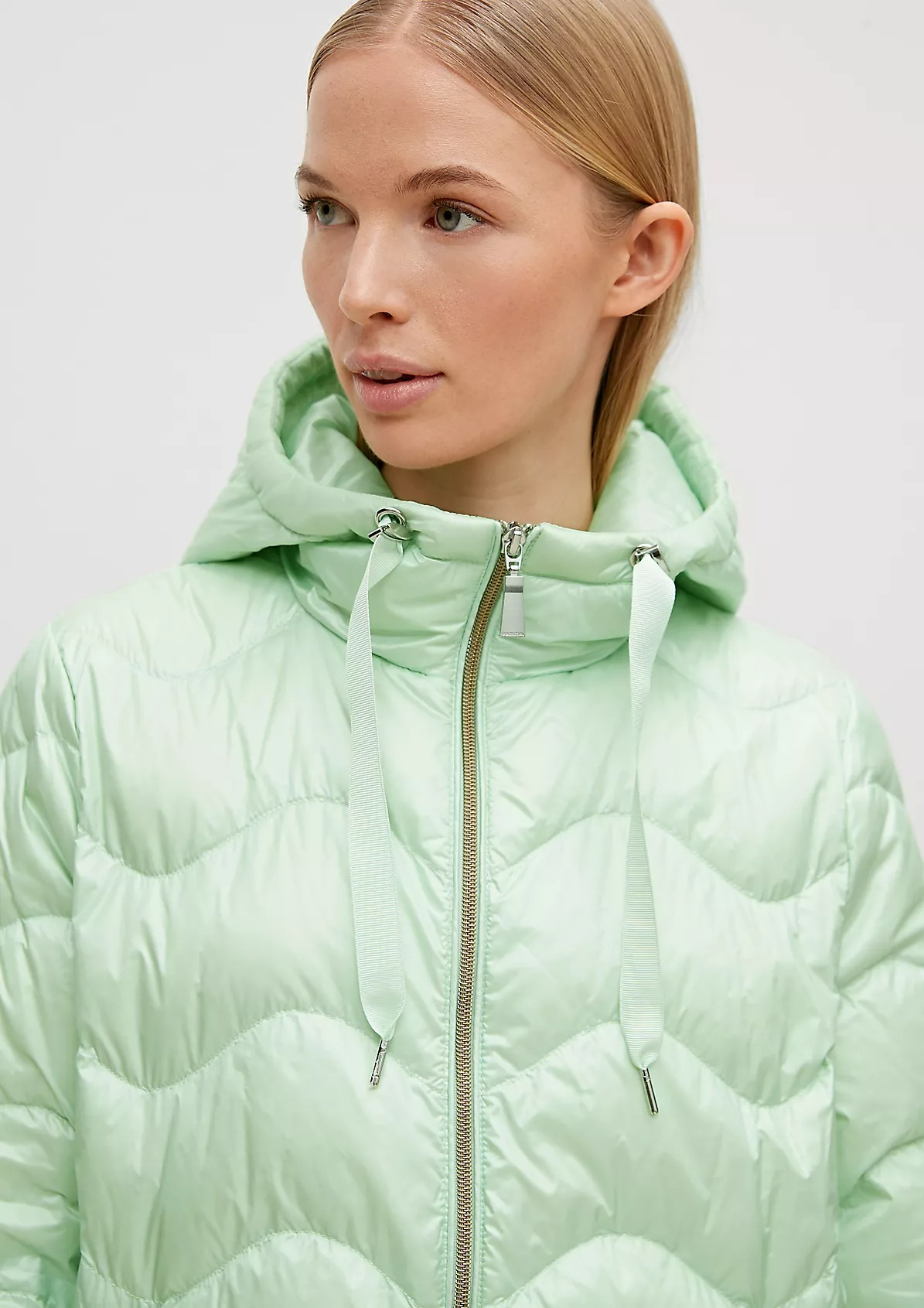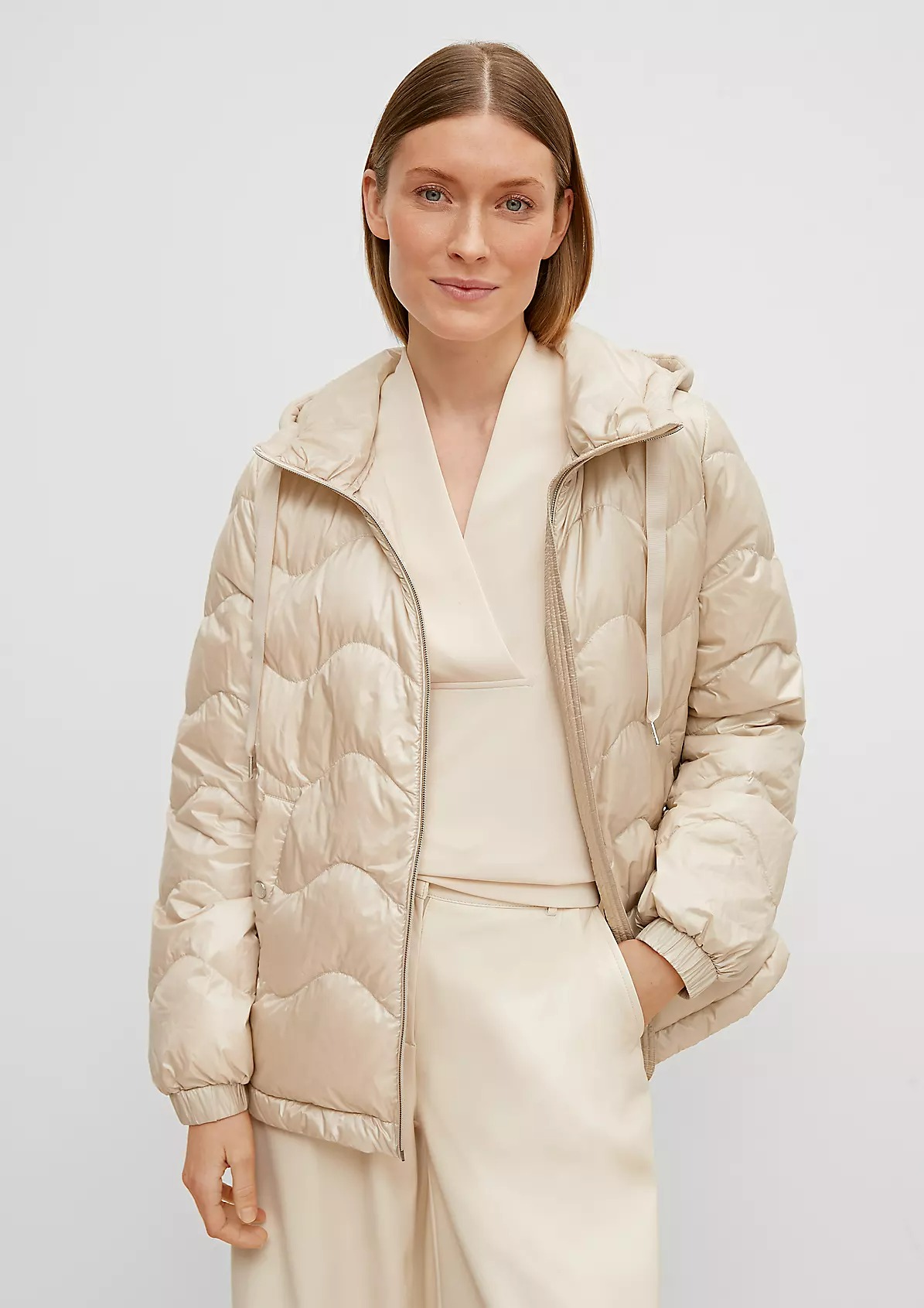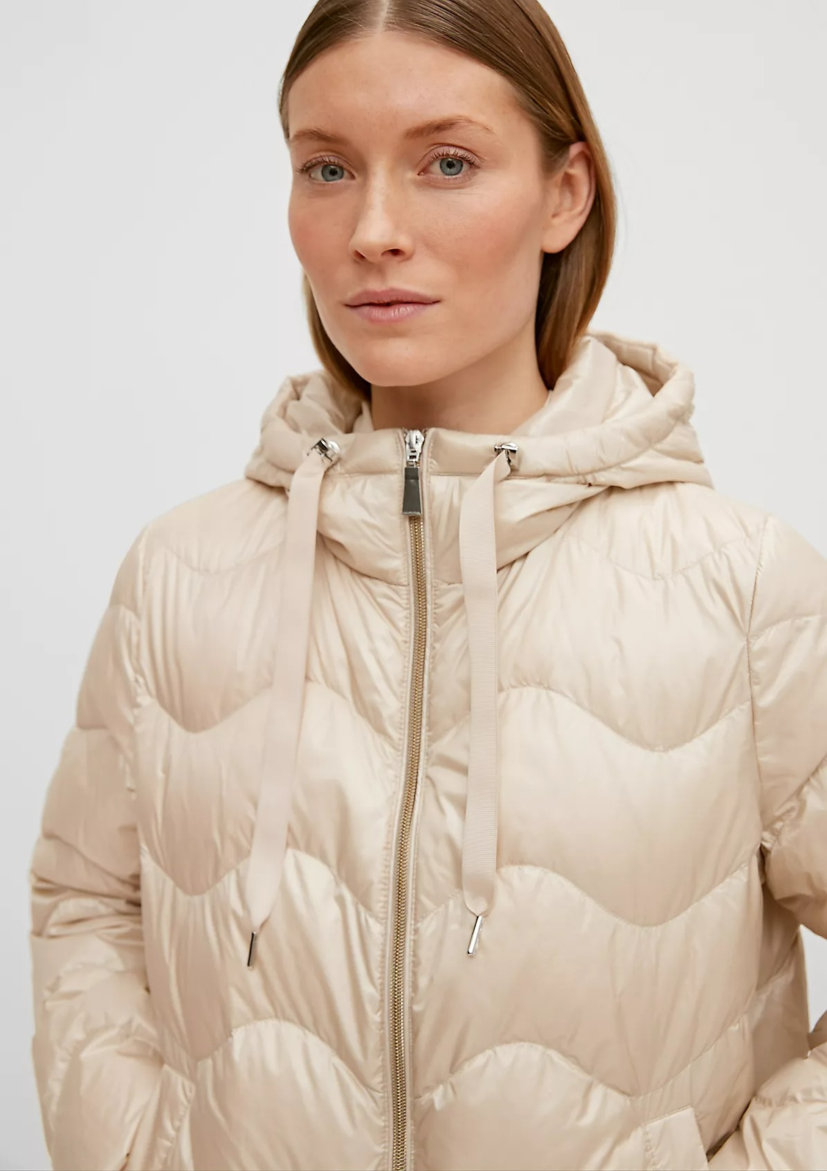 На сайте указаны российские размеры. Короткая куртка с капюшоном и стеганой отделкой. Подкладка: подкладка из тафты. Наполнитель: пух и перья. Длинные рукава, эластичные манжеты. Длина спины: 64 см в размере 42 Рост модели: 178 см
