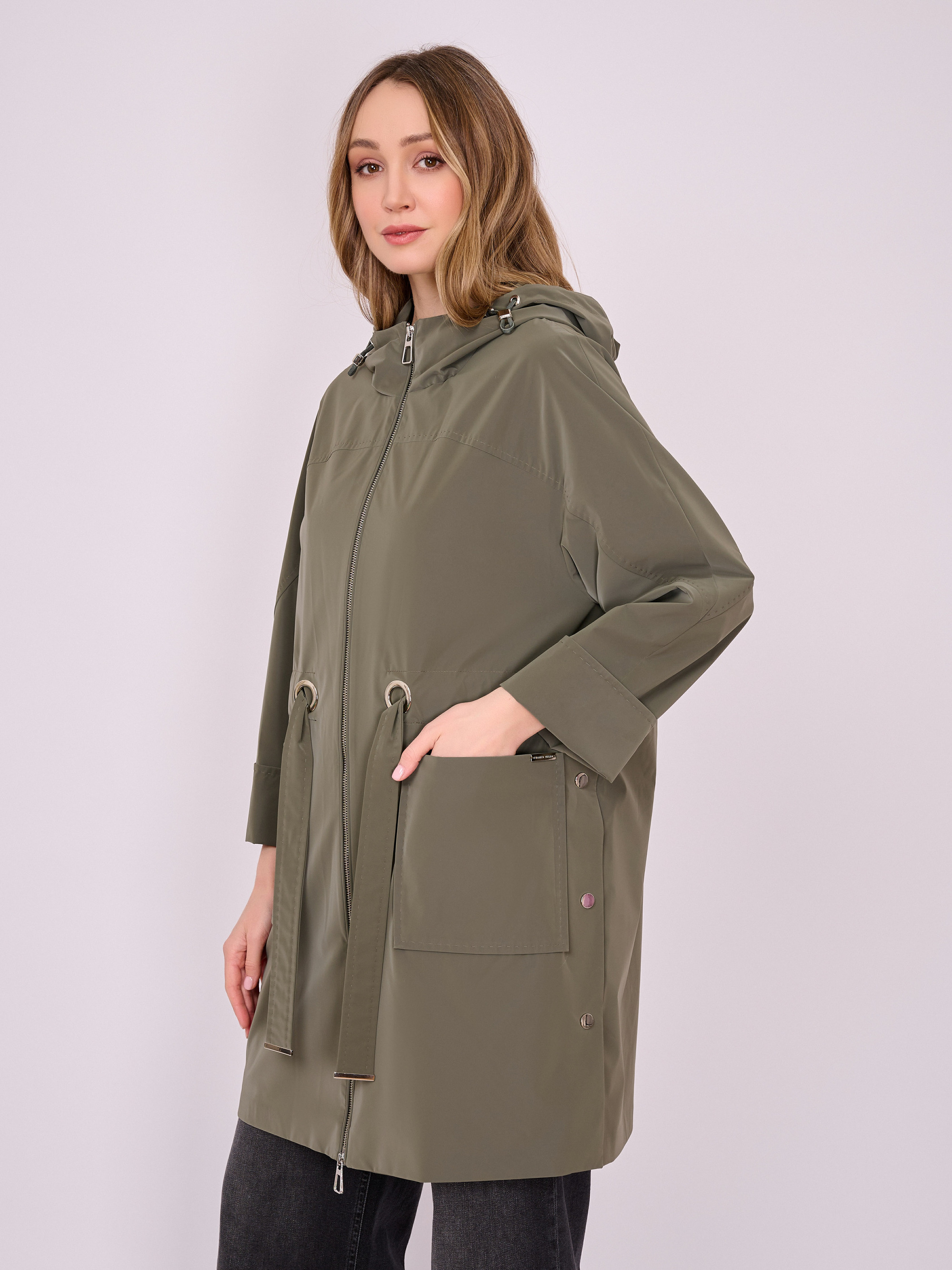 На сайте указаны российские размеры. Укороченный прямой плащ на молнии с капюшоном, длинными рукавами с отворотами, накладными карманами и кулиской по линии талии. Боковые разрезы застегиваются на кнопки. Длина по спинке: 90 см. Рост модели: 175 см.
