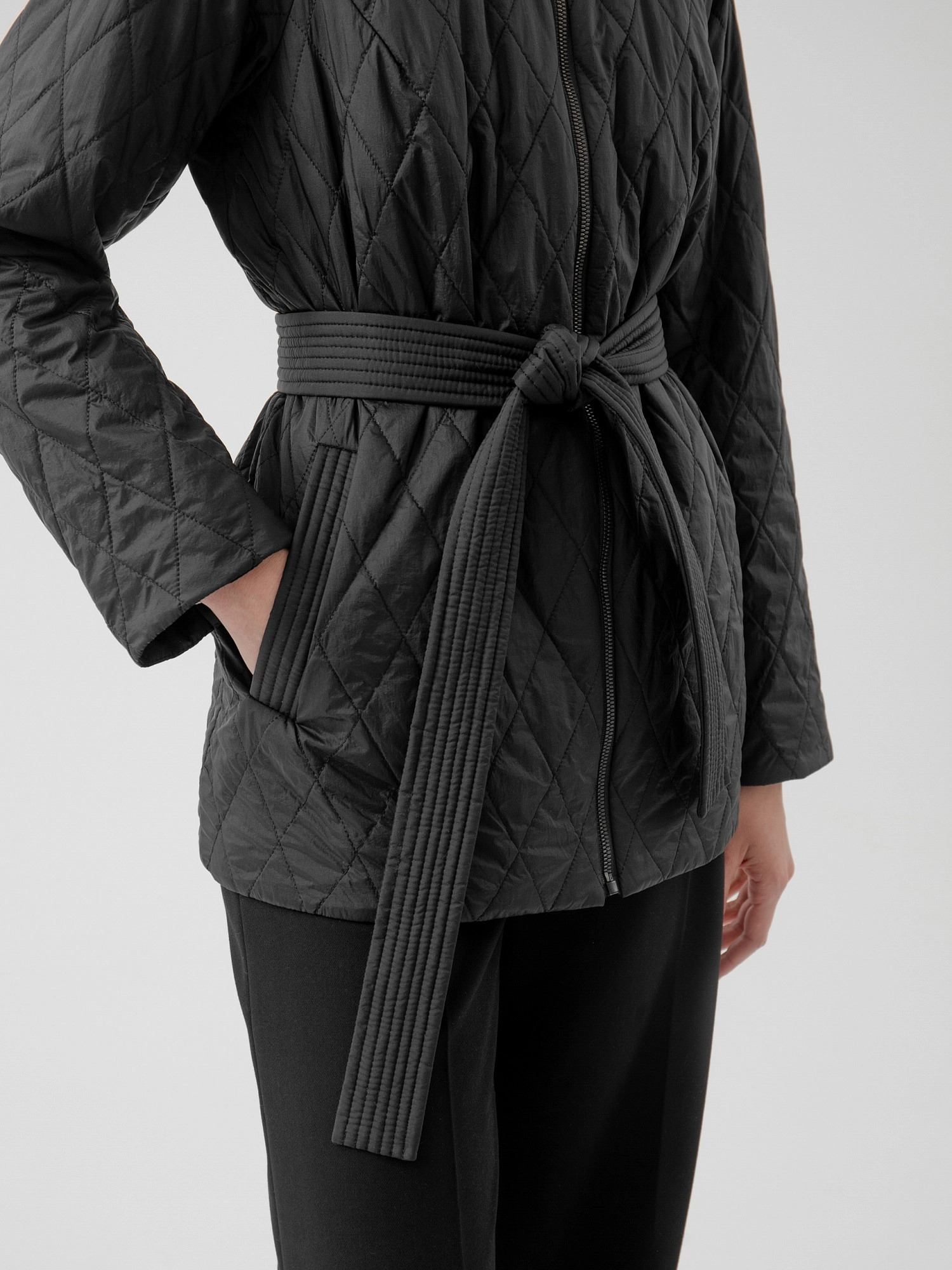 На сайте указаны российские размеры. Укороченная куртка из стеганой плащевой ткани в глубоком черном цвете. Куртка имеет высокий и комфортный воротник-стойку, надежную застежку на тракторную молнию и пояс из основной ткани в комплекте, который позволяет сделать силуэт еще более женственным и подчеркнуть талию. Длина изделия: 72 см. Рост модели 175 см.