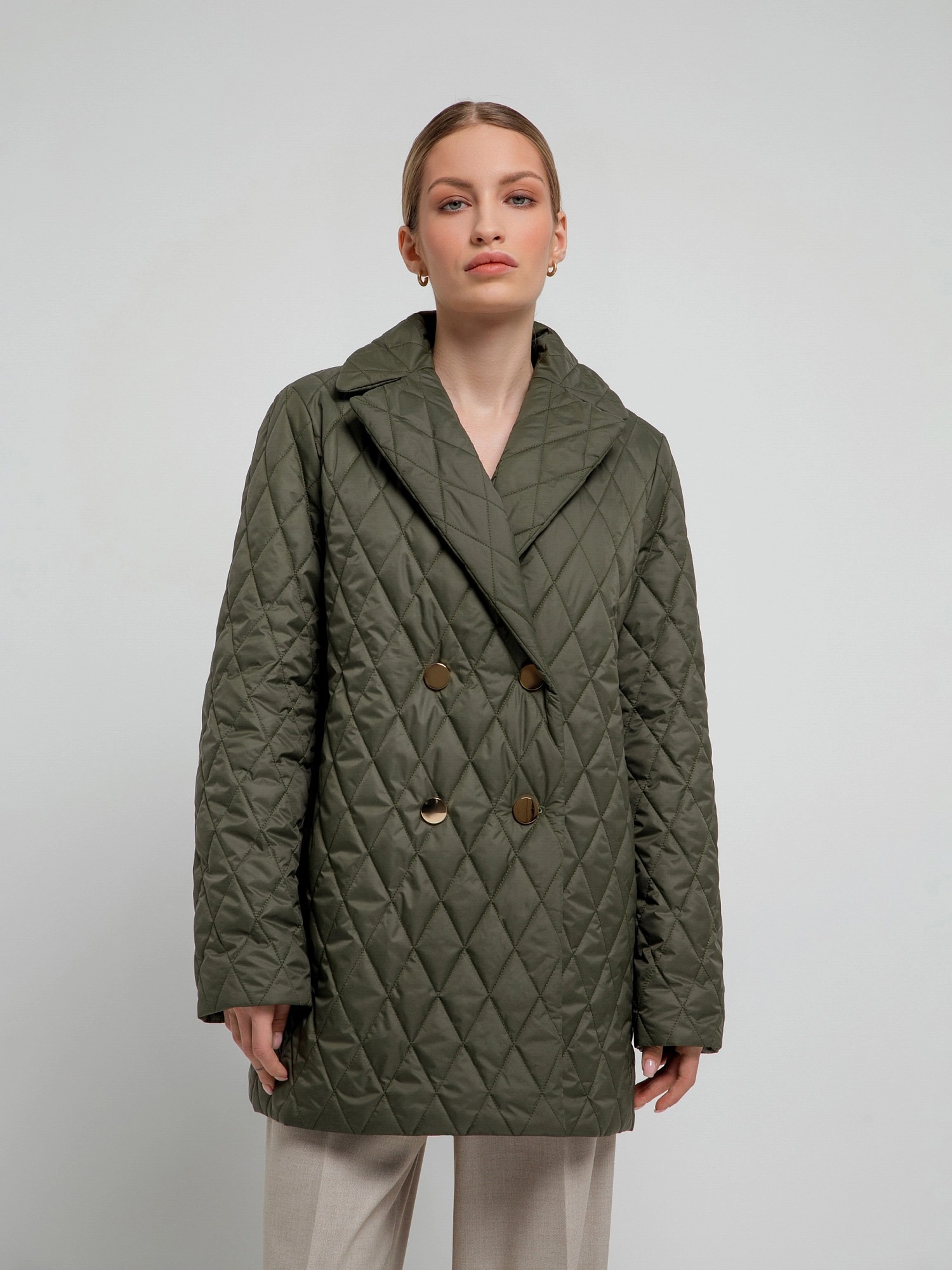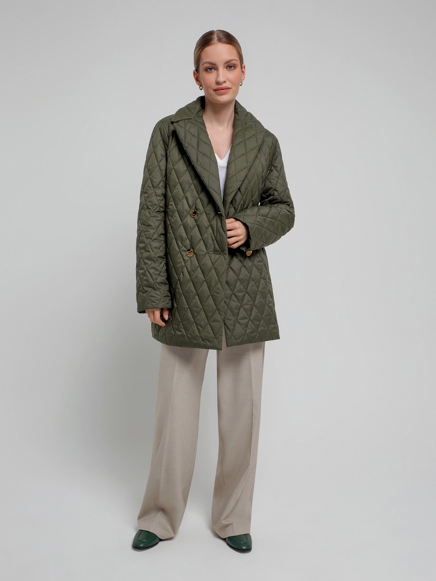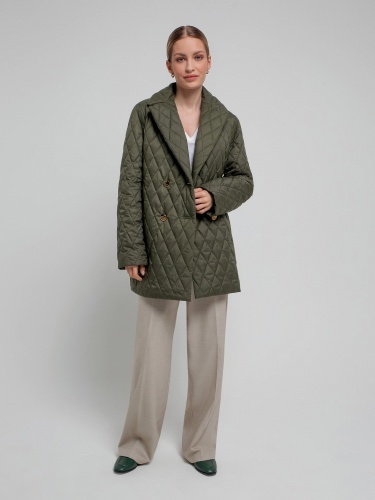 На сайте указаны российские размеры. Стеганая куртка полуприлегающего силуэта из плащевой ткани благородного цвета хаки. Куртка имеет комфортную и универсальную длину на весну, а приталенная форма подчеркнет женственность форм в любом образе. Классический английский воротник придает образу геометричности, а стеганая ткань - модной остроты. Глубокие и функциональные карманы в рельефах очень вместительные, при этом не создают дополнительного объема. Куртка произведена из плотной и мягкой плащевой ткани с утеплителем и высокотехнологичной мембраной RaftPro, которая создает дополнительную надежную защиту от ветра. Длина изделия: 77 см. Рост модели 175 см.