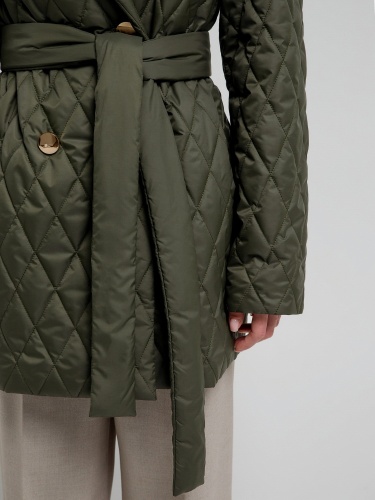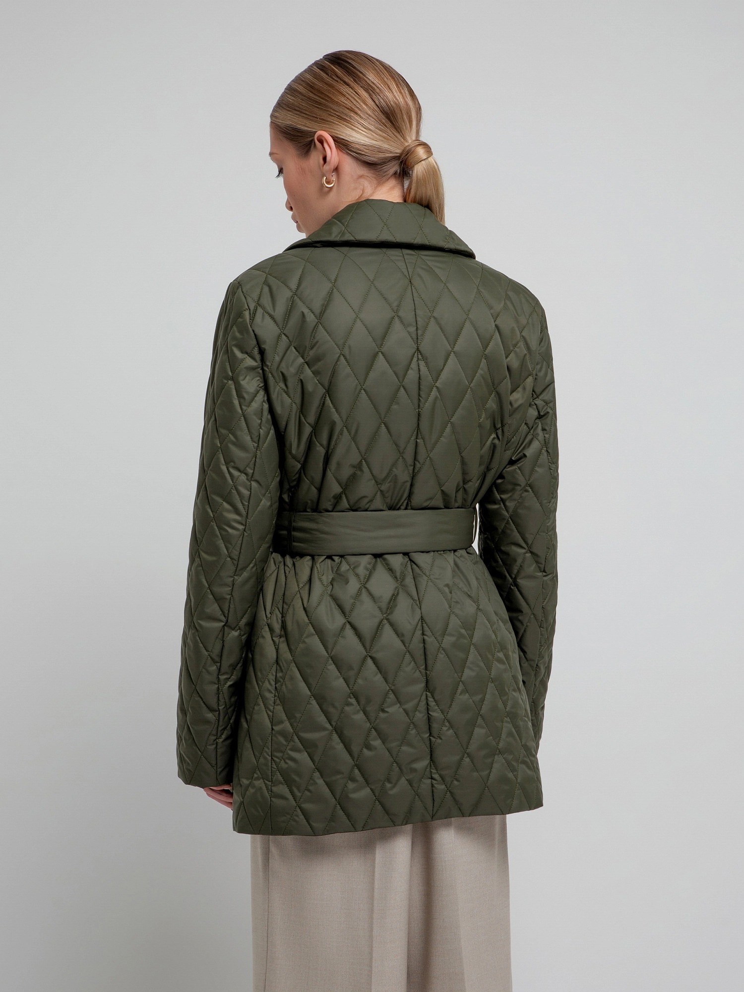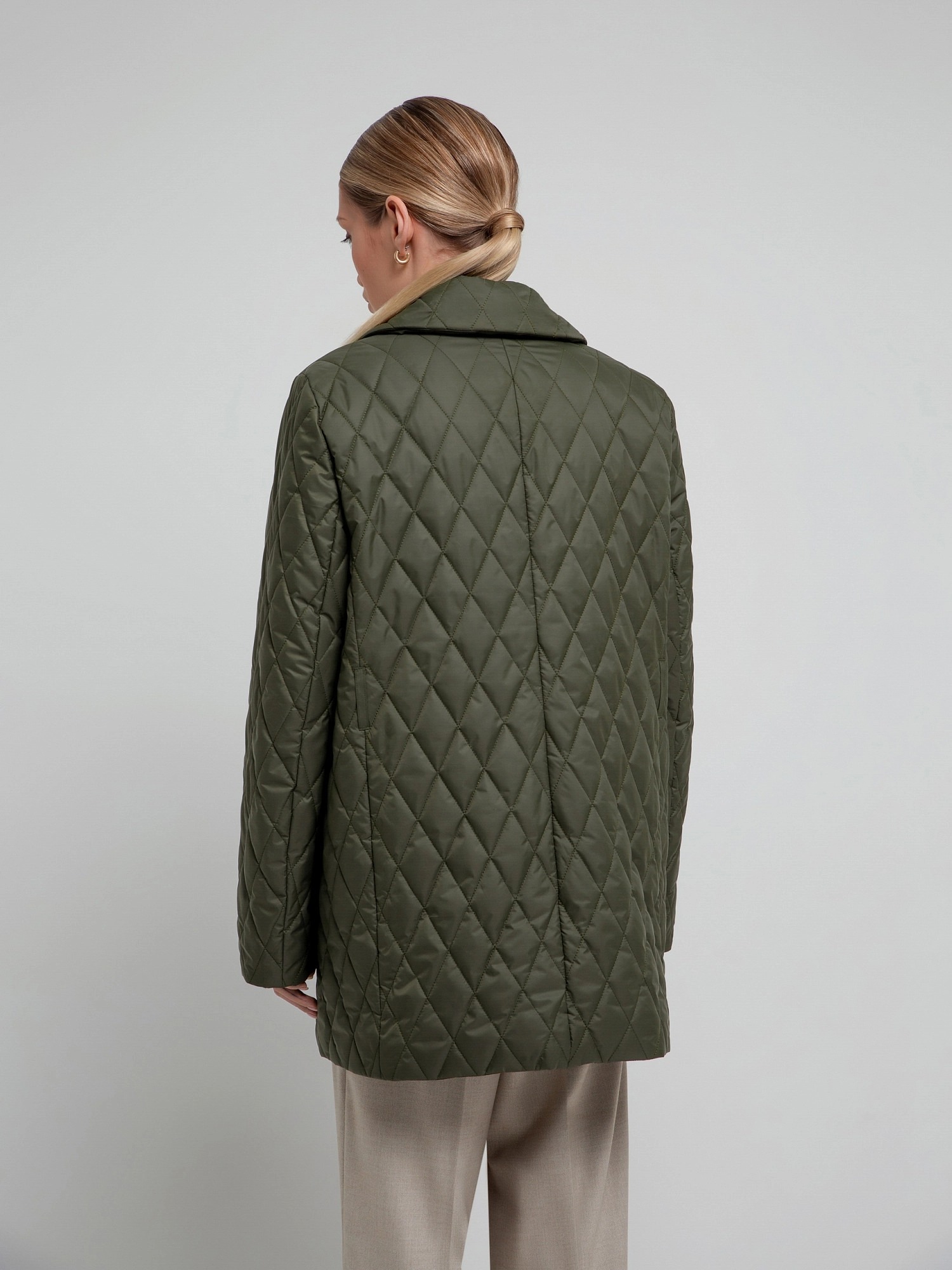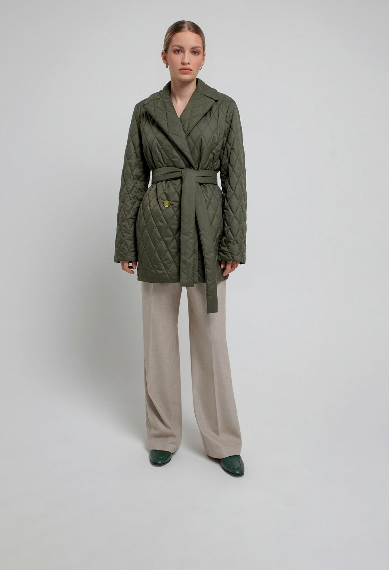 На сайте указаны российские размеры. Стеганая куртка полуприлегающего силуэта из плащевой ткани благородного цвета хаки. Куртка имеет комфортную и универсальную длину на весну, а приталенная форма подчеркнет женственность форм в любом образе. Классический английский воротник придает образу геометричности, а стеганая ткань - модной остроты. Глубокие и функциональные карманы в рельефах очень вместительные, при этом не создают дополнительного объема. Куртка произведена из плотной и мягкой плащевой ткани с утеплителем и высокотехнологичной мембраной RaftPro, которая создает дополнительную надежную защиту от ветра. Длина изделия: 77 см. Рост модели 175 см.