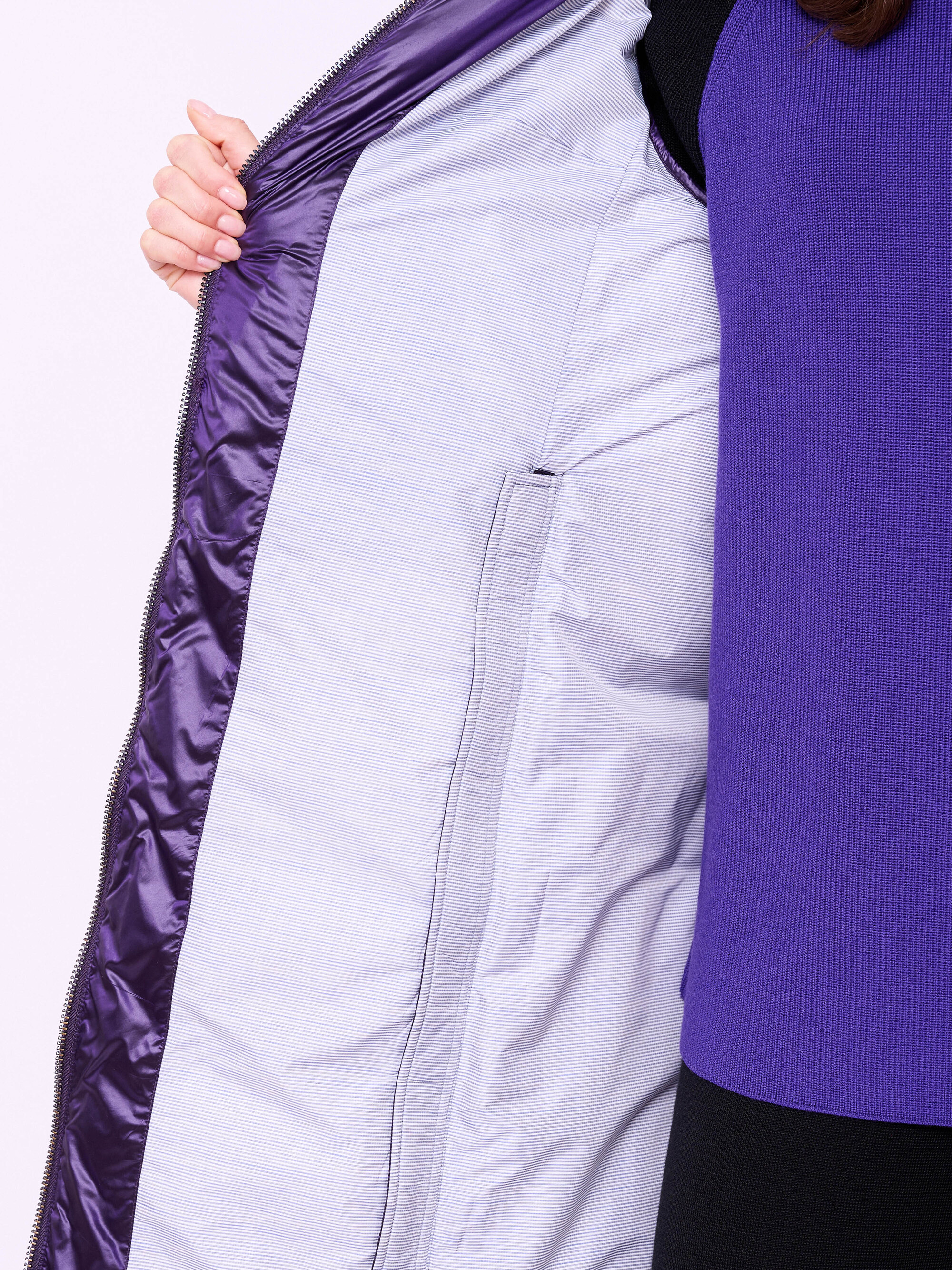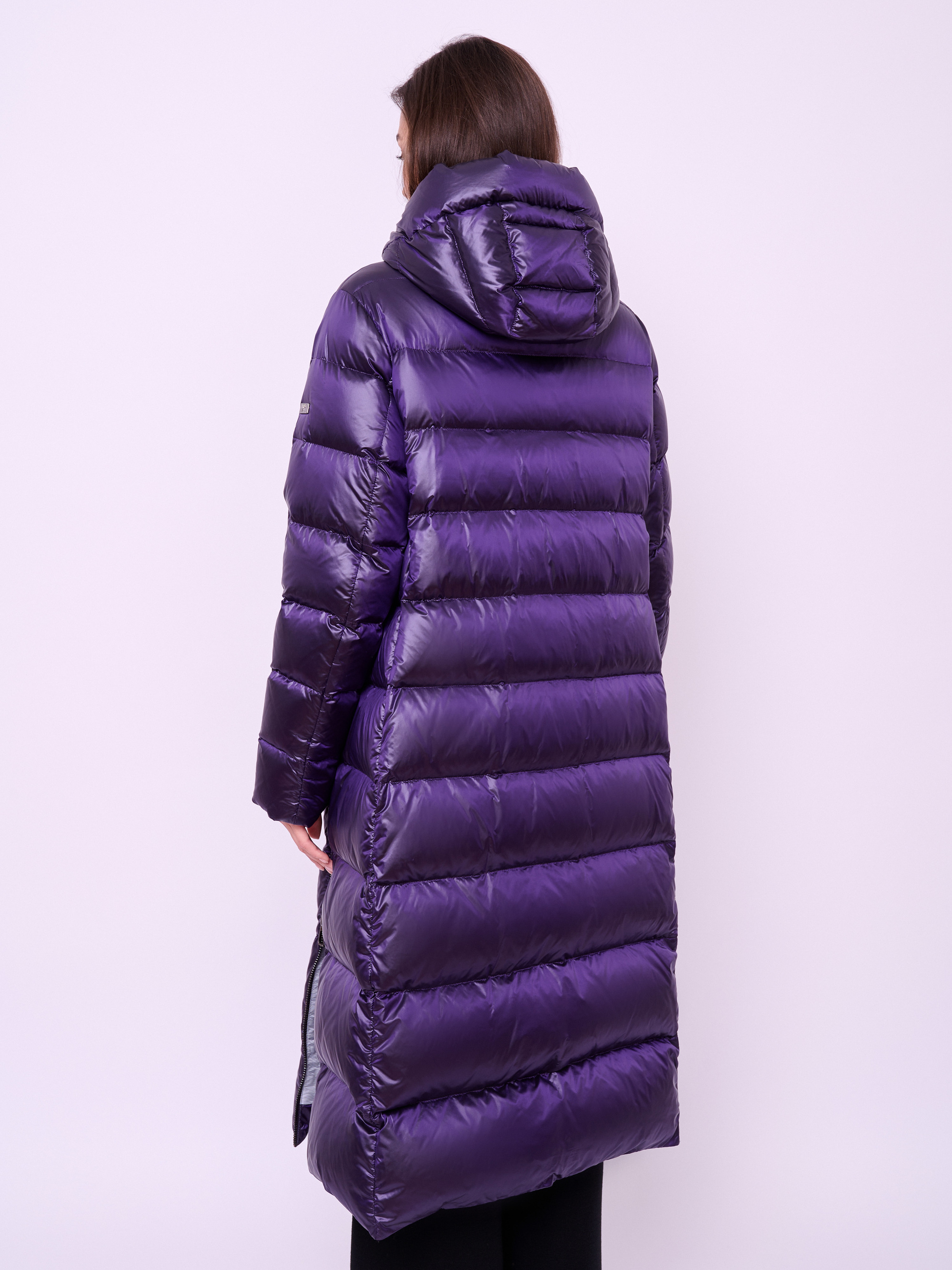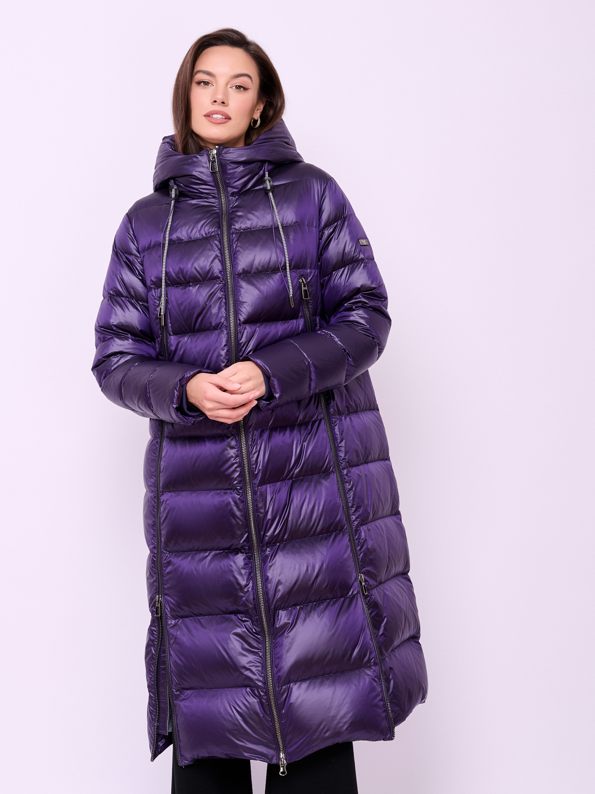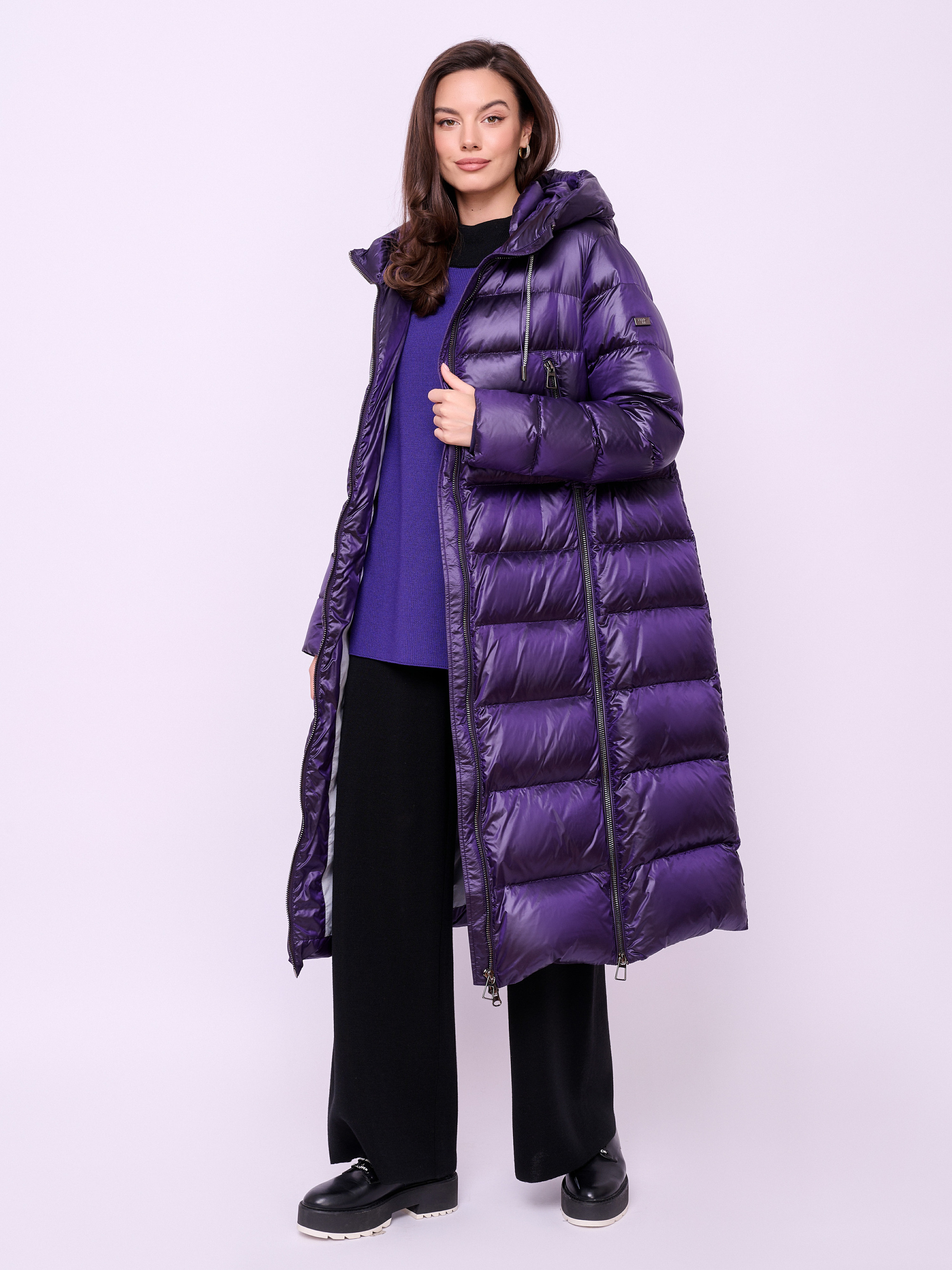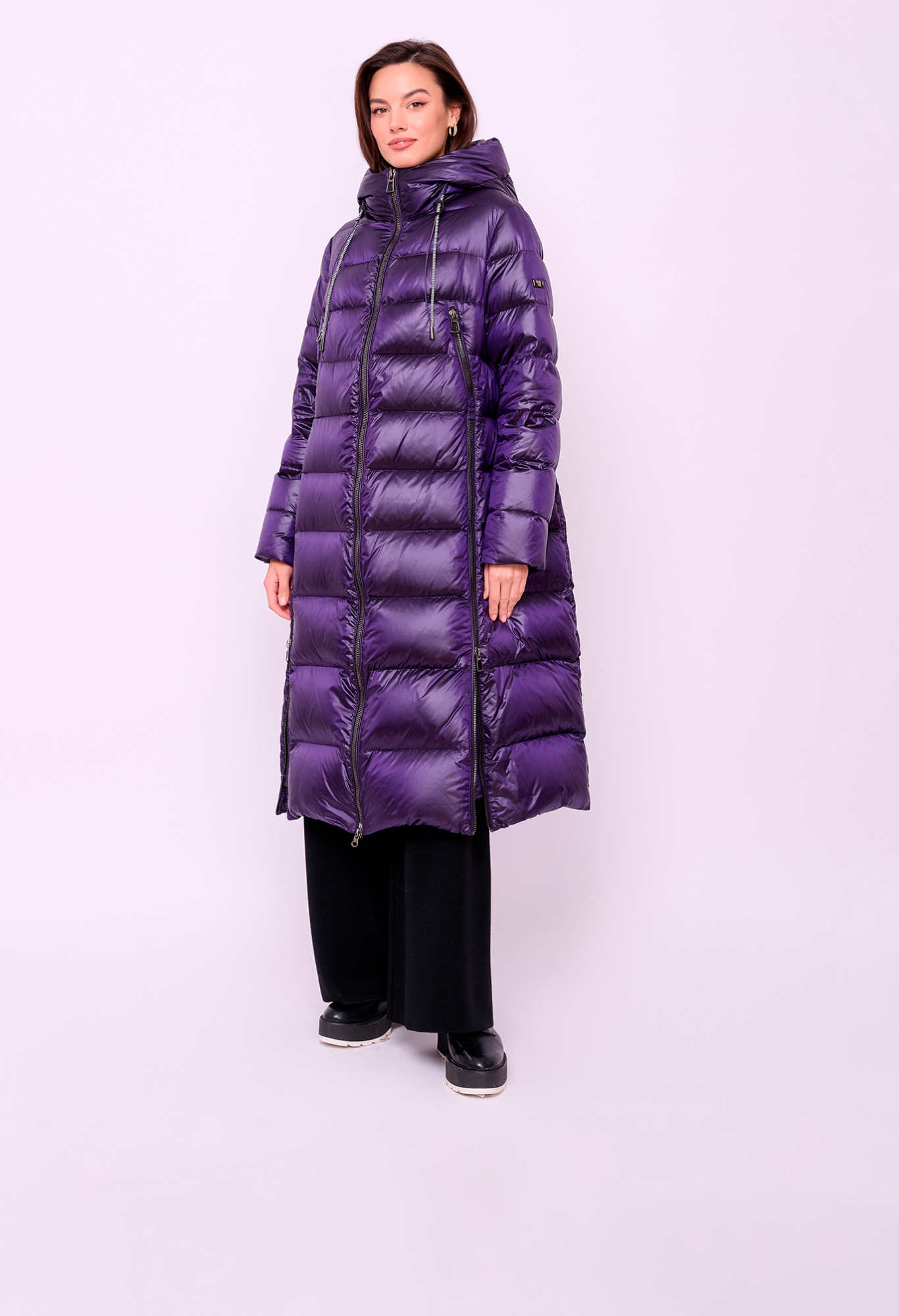 Пальто-пуховик стеганое с высоким воротом, несъемным капюшоном на кулиске, без опушки, с длинными рукавами-реглан с трикотажными манжетами, прорезными карманами на молнии и длинными разрезами на молнии. Длина по спине: 111 см.