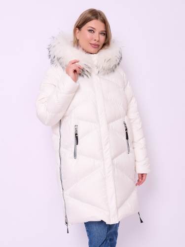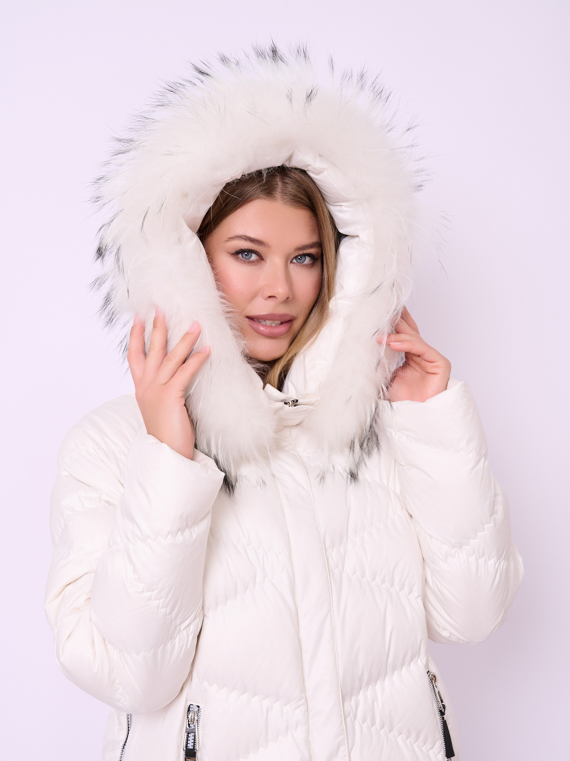 Стеганая куртка-пуховик на молнии и кнопках с высоким воротом, несъемным капюшоном со съемной опушкой из меха енота, длинными рукавами-реглан, прорезными карманами на молнии и высокими боковыми разрезами на молнии. Длина по спинке: 92 см.