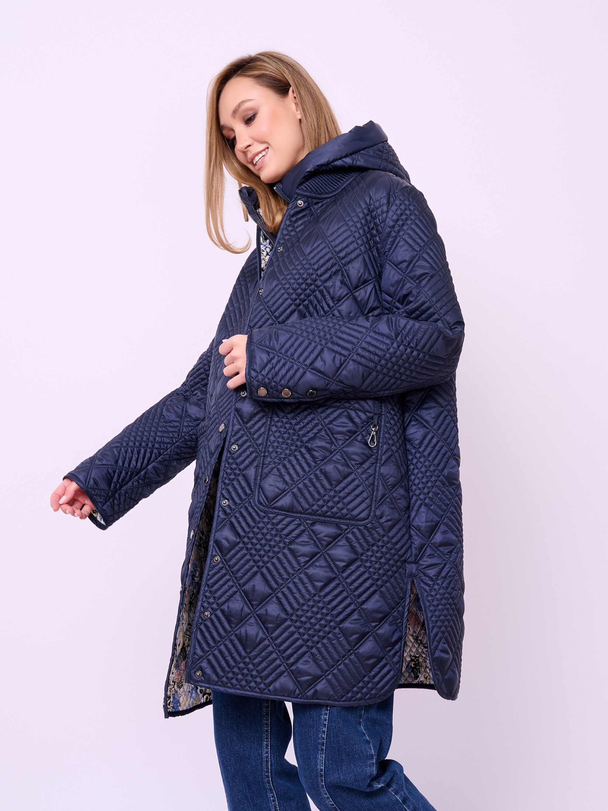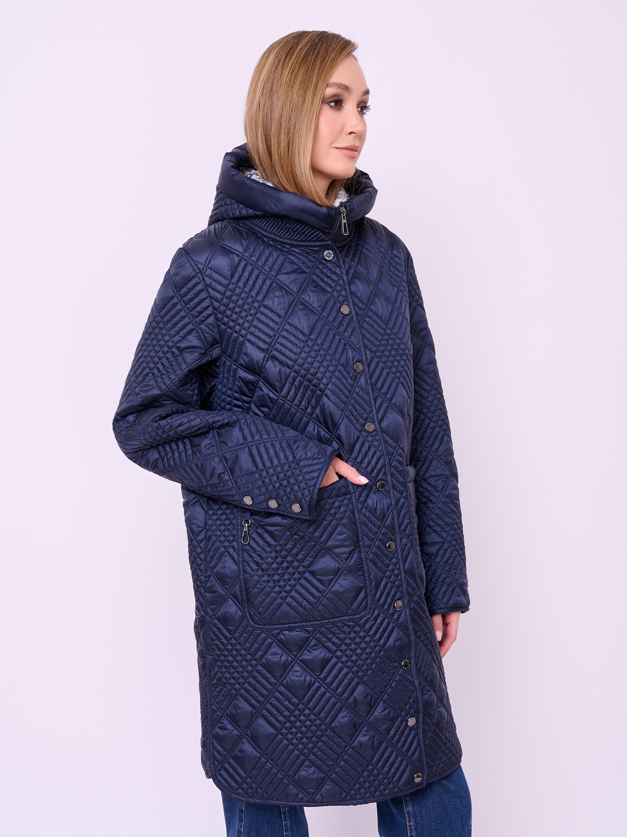 Утепленное стеганое пальто прямого покроя средней длины с воротником-стойкой, съемным капюшоном-манишкой, длинными рукавами на кнопках, накладынми карманами и рукавицами из основного материала. Длина по спинке: 92 см