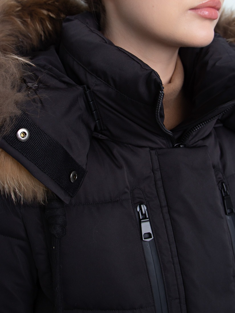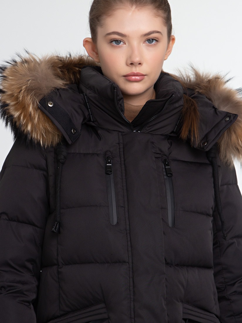 Парка средней длины изготовлена из плотного матового не продуваемого полиэстера. Изделие утеплили легким био-пухом. Глубокий отстегивающийся капюшон со съемной отделкой из меха енота не оставит шансов ветру. За дополнительный комфорт отвечают широкая планка, теплые карманы и внутренние трикотажные ветрозащитные манжеты. Пуховик декорирован фактурными лентами черного цвета, которые дополнительно усиливают кнопки. Длина: 106 см. Утеплитель: 290 грамм/м2