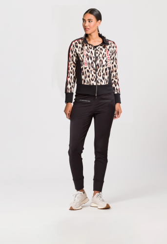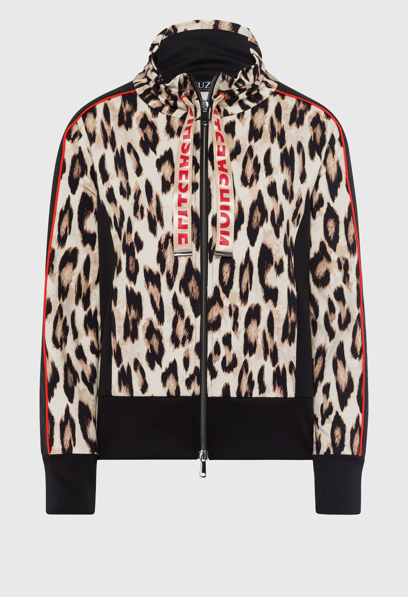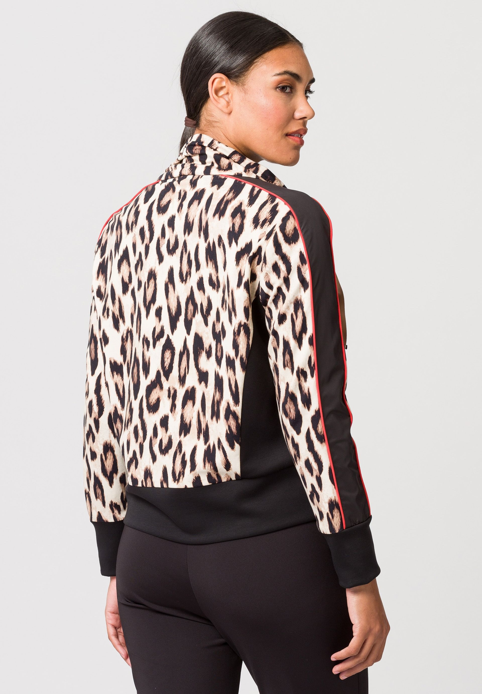 Легкая женская куртка с воротником стойкой и принтованными атласными лентами. Животные принты вряд ли когда-нибудь выйдут из моды, поэтому эта легкая куртка станет вечной модной классикой. Модный дизайн дополняется матовой блестящей тканью и контрастной окантовкой рукавов. Воротник-стойка выглядит стильно благодаря декоративным атласным лентам с принтом. Удобная куртка из джерси, которая подчеркнет спортивный, гламурный повседневный образ.