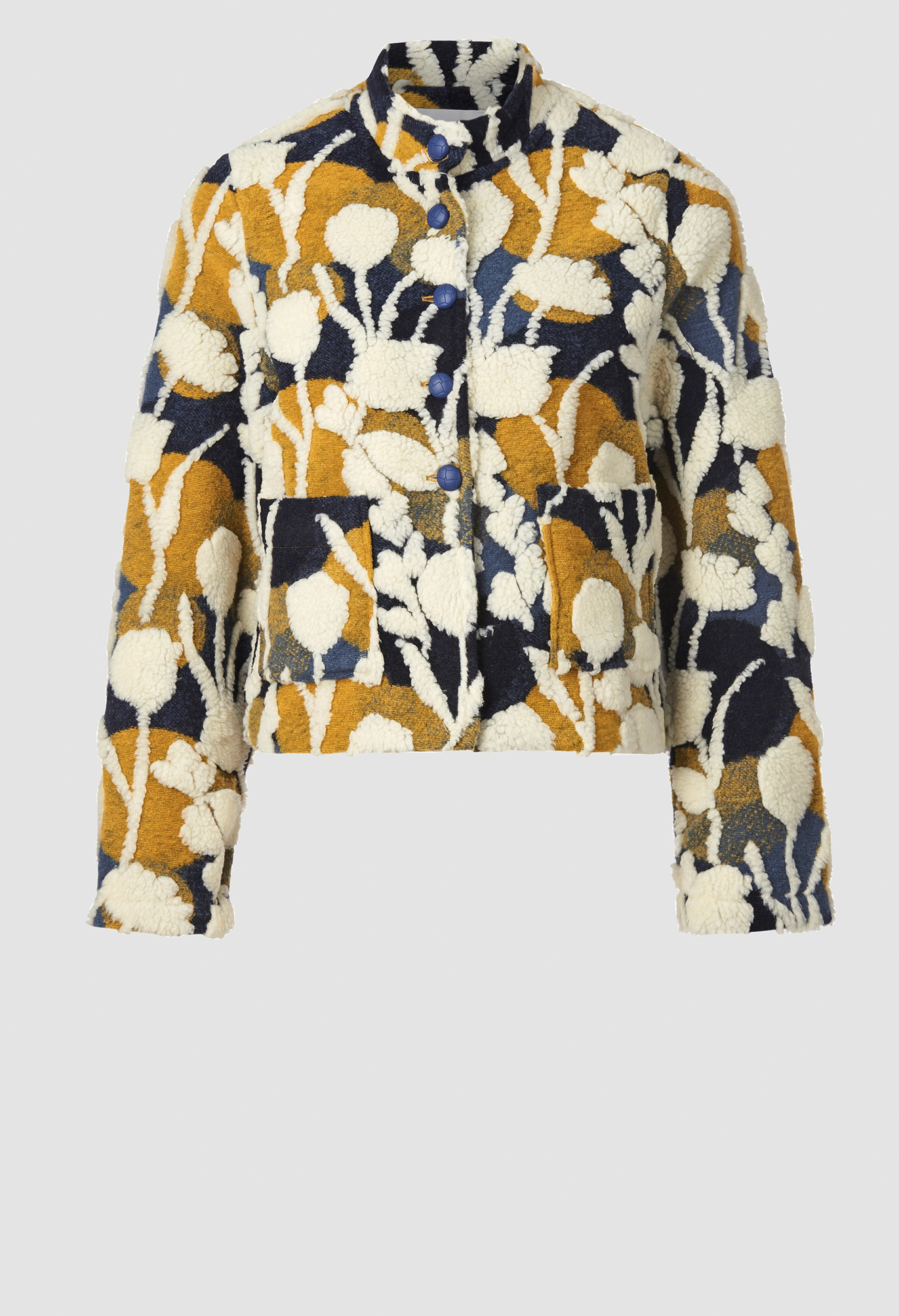 Плюшевая куртка с цветочным узором имеет удобный прямой крой. Он изготовлен из букле и мягкого плюшевого материала. Пуговицы приклеены, карманы пристрочены. Длина для размера 42: 56 см.