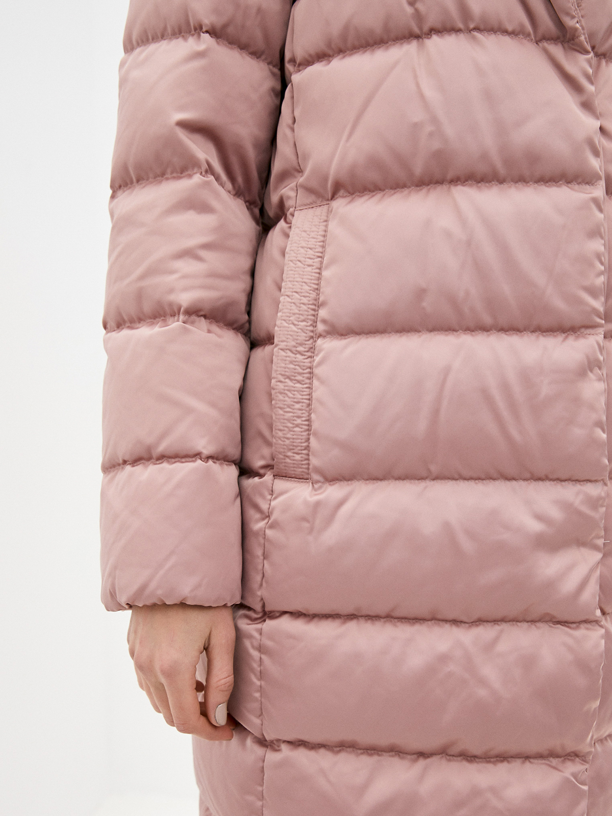 Однотонные зимнее пальто в пыльно-розовой расцветке. Натуральный пуховый наполнитель с добавлением пера. Застежка на молнию, ветрозащитная планка. Воротник стойка. Два боковых кармана с листочкой, плюс внутренний карман.