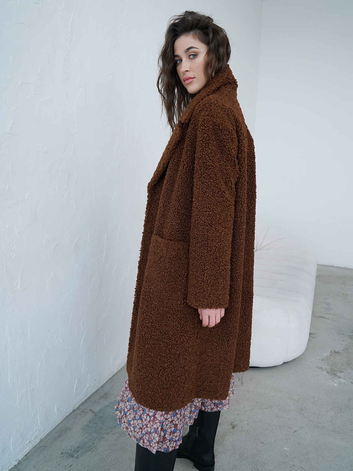 Пальто свободного кроя создано из однотонного искусственного меха. Классический воротник с лацканами, накладные карманы, застежка на пуговицы.