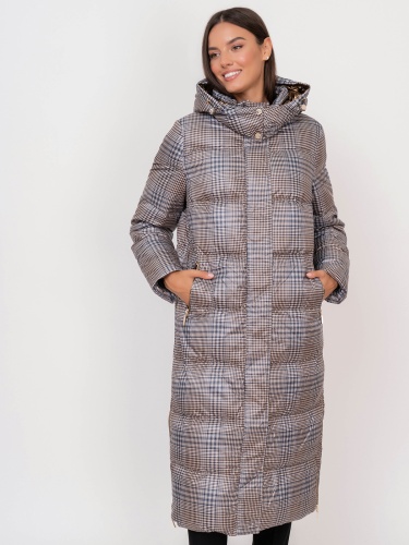 Стеганое пальто в клетку с пуховым наполнителем. Застежка на двойную молнию, ветрозащитная планка со скрытыми кнопками. Объемный капюшон, воротник стойка. Стильный базовый вариант пуховика, хорошо сочетается с различными нарядами.