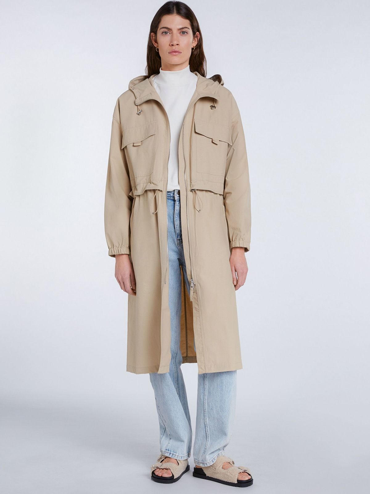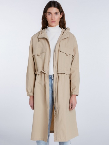 Однотонный плащ в трендовой нюдовой расцветке. Глубокий капюшон с кулиской, воротник-стойка. Кулиска на поясе позволяет создать приталенный силуэт. Объемные накладные карманы на груди, спущенная линия плеч.