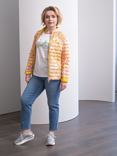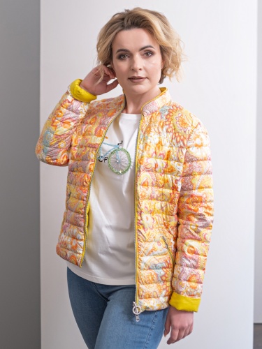 Стеганая куртка в ярком узоре. Воротник-стойка, застежка-молния. Прорезные карманы на молнии. Втачной рукав полной длины. Куртка прекрасно завершит яркий образ в городском повседневном стиле.