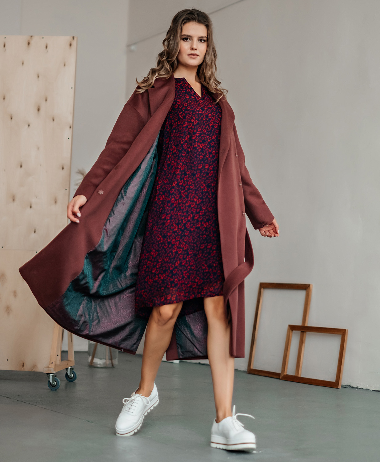 Пальто прямого силуэта длиной выше колена. Втачной рукав, застёжка на пришивные кнопки, английский воротник, горизонтальный подрез на полочке и спинке, вертикальные карманы-листочки.