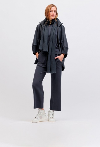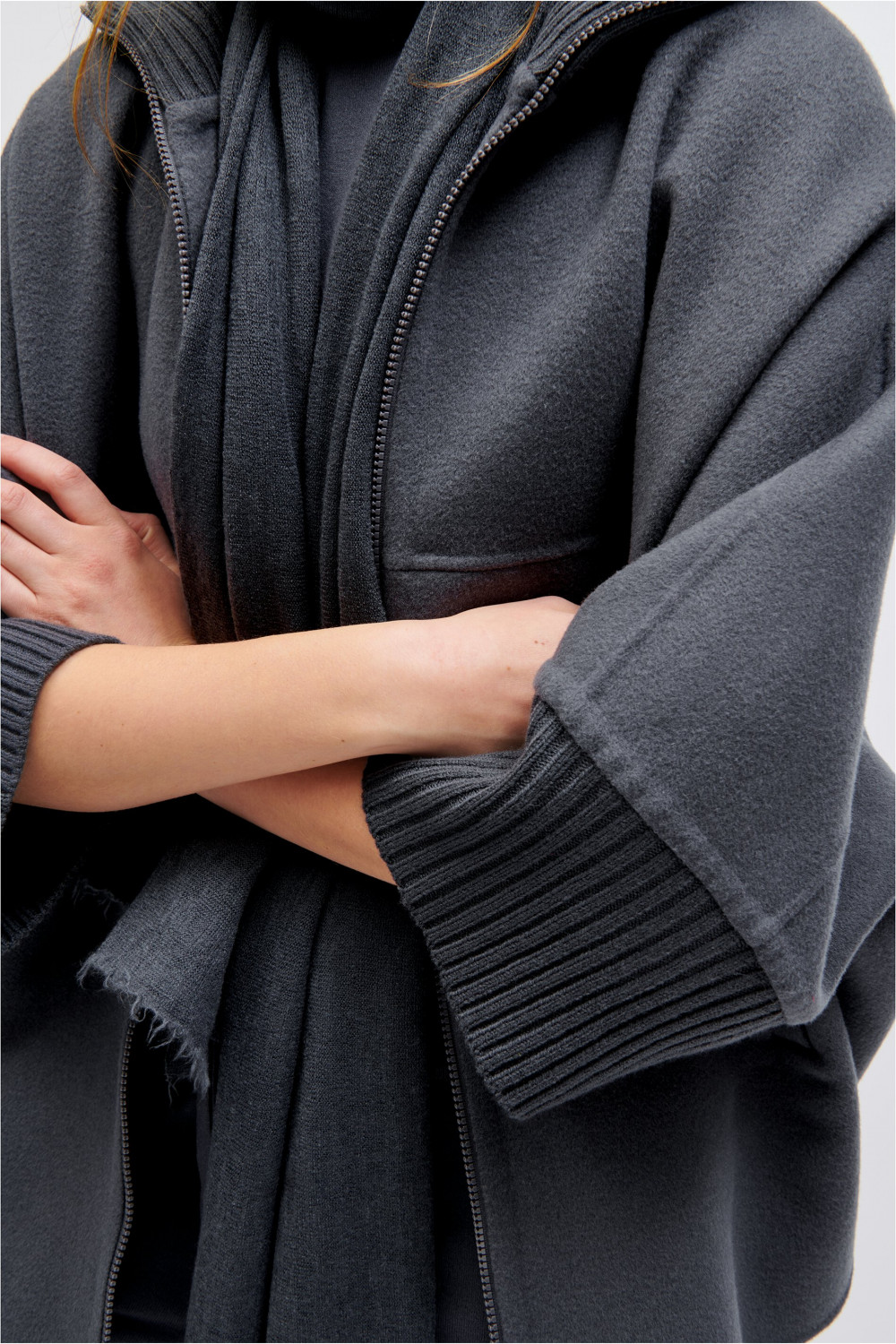 На сайте указаны российские размеры. Куртка-накидка из роскошной смеси шерсти и кашемира с высококачественной двусторонней отделкой и непрерывной двусторонней застежкой-молнией. Объемный воротник-стойка и широкие трикотажные манжеты создают изысканный контраст материалов. Модель ростом 178 см