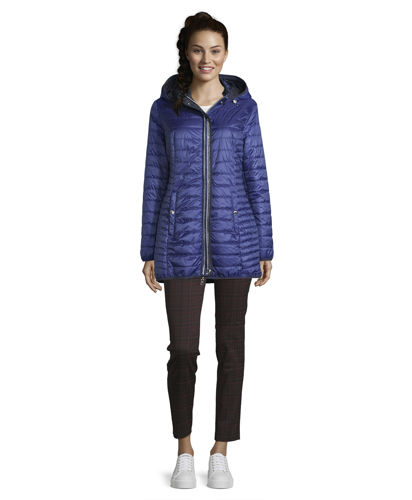 Стеганое пальто на синтепоне - наш модный ответ непогоде! Удобная длина выше колена. Слегка прилегающий силуэт подчеркивает достоинства фигуры. Капюшон на кулиске, практичный воротник-стойка. Карманы на кнопках. Ветрозащитная планка декорирована тесьмой с нитью люрекса, что придает образу нотку гламура. Эта модель - для тех, кто идет в ногу со временем и занимает активную жизненную позицию.
