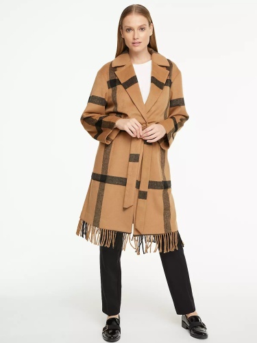 Пальто-халат в крупную клетку. Стильная деталь в виде бахромы по низу изделия. Отложной воротник с лацканами, длинный втачной рукав. В комплекте идет пояс из основного материала изделия.