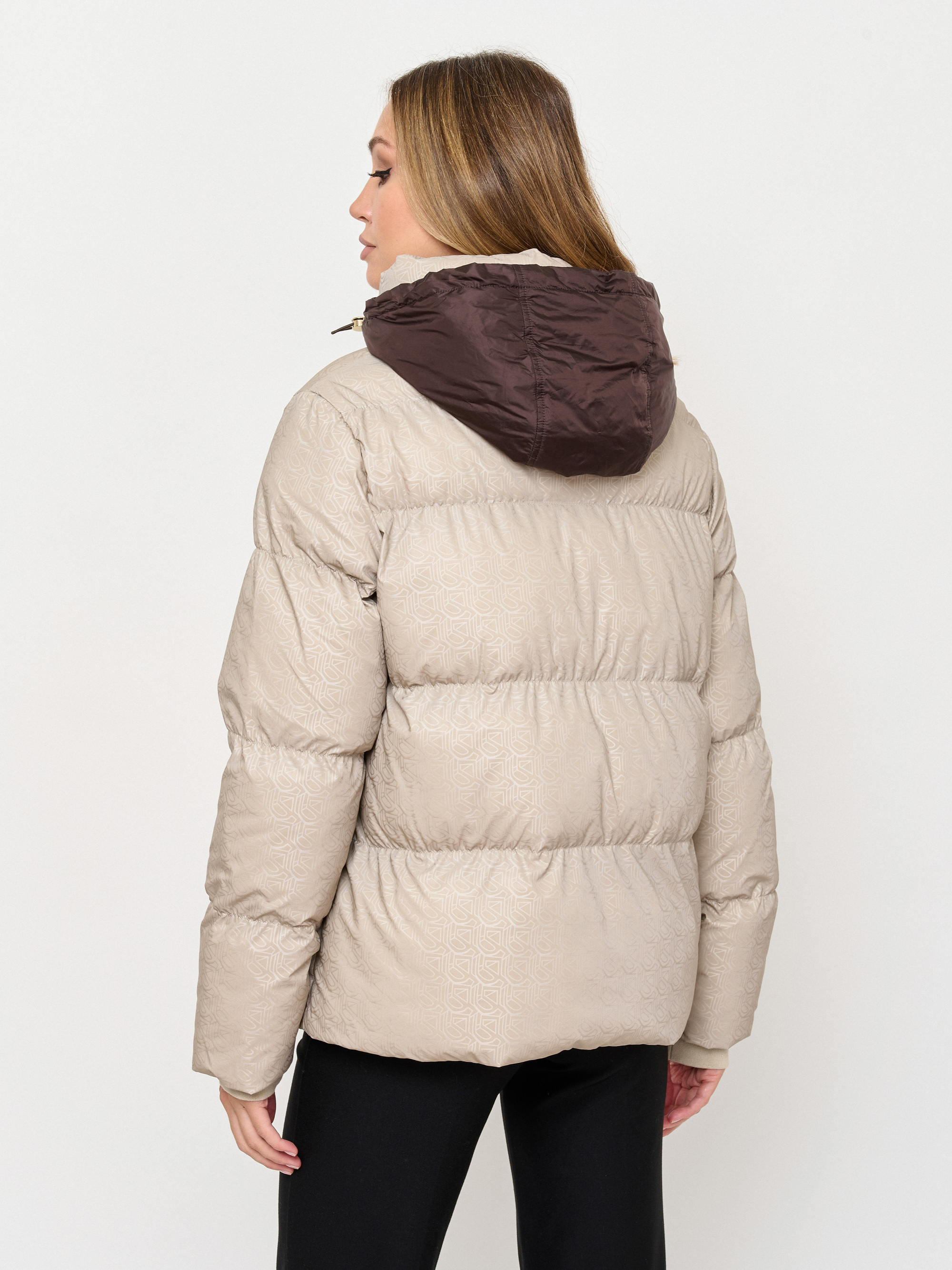 Укороченный пуховик с наполнителем DuPont Sorona (био-пух) предназначена для температурного диапазона от 0°C до -15°C. Ткань верха - 100 % полиуретан с нанесением силиконового принта; подкладка - классический 100% нейлон цвета dusty brown; утеплитель - cинтепух DuPont Sorona (100% полиэстер). Детали: застежка молния, опции капюшона капюшон прячется в воротник, рукава длинные, покрой прямой, рисунок орнамент, утеплитель полиэстер, карманы прорезные, без опушки.