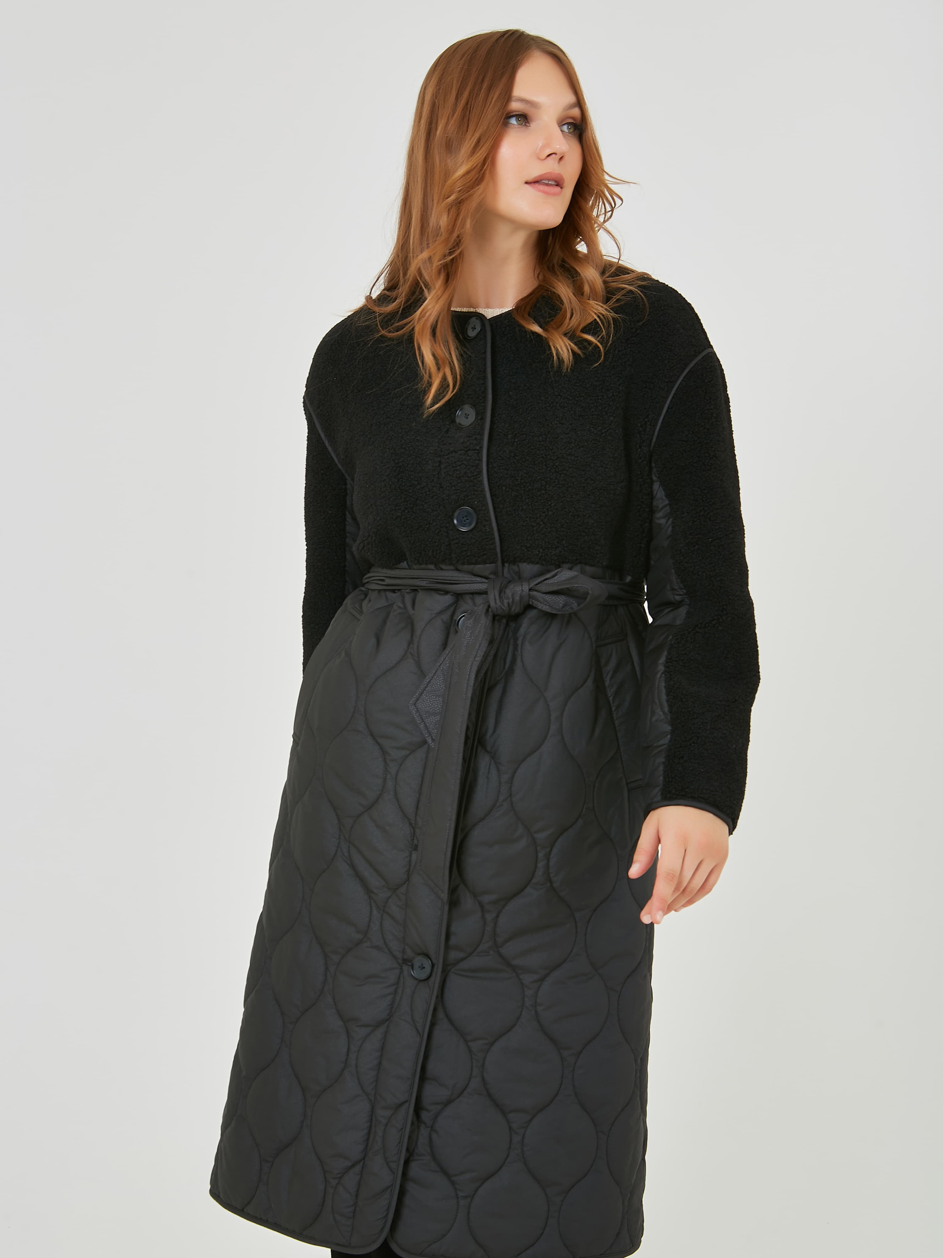 Пальто прямого кроя с крупными пуговицами сочетает мягкий светлый материал в верхней части с бежевым стеганым низом, придающим тепло и уют.Осень-Зима'25/26. Капсула "Вишневый сад". Параметры модели: 95-64-101, рост 175, размер 44-46