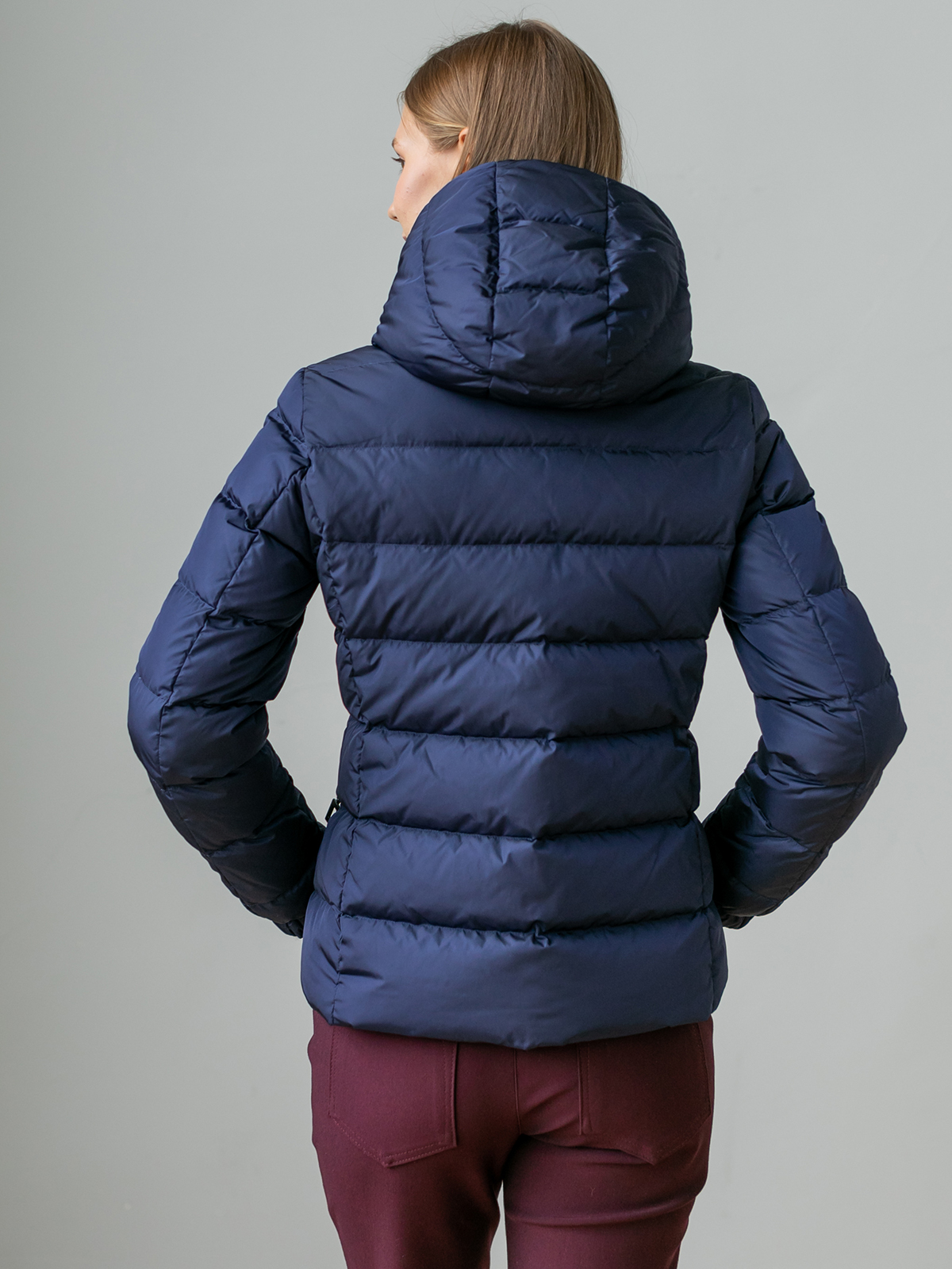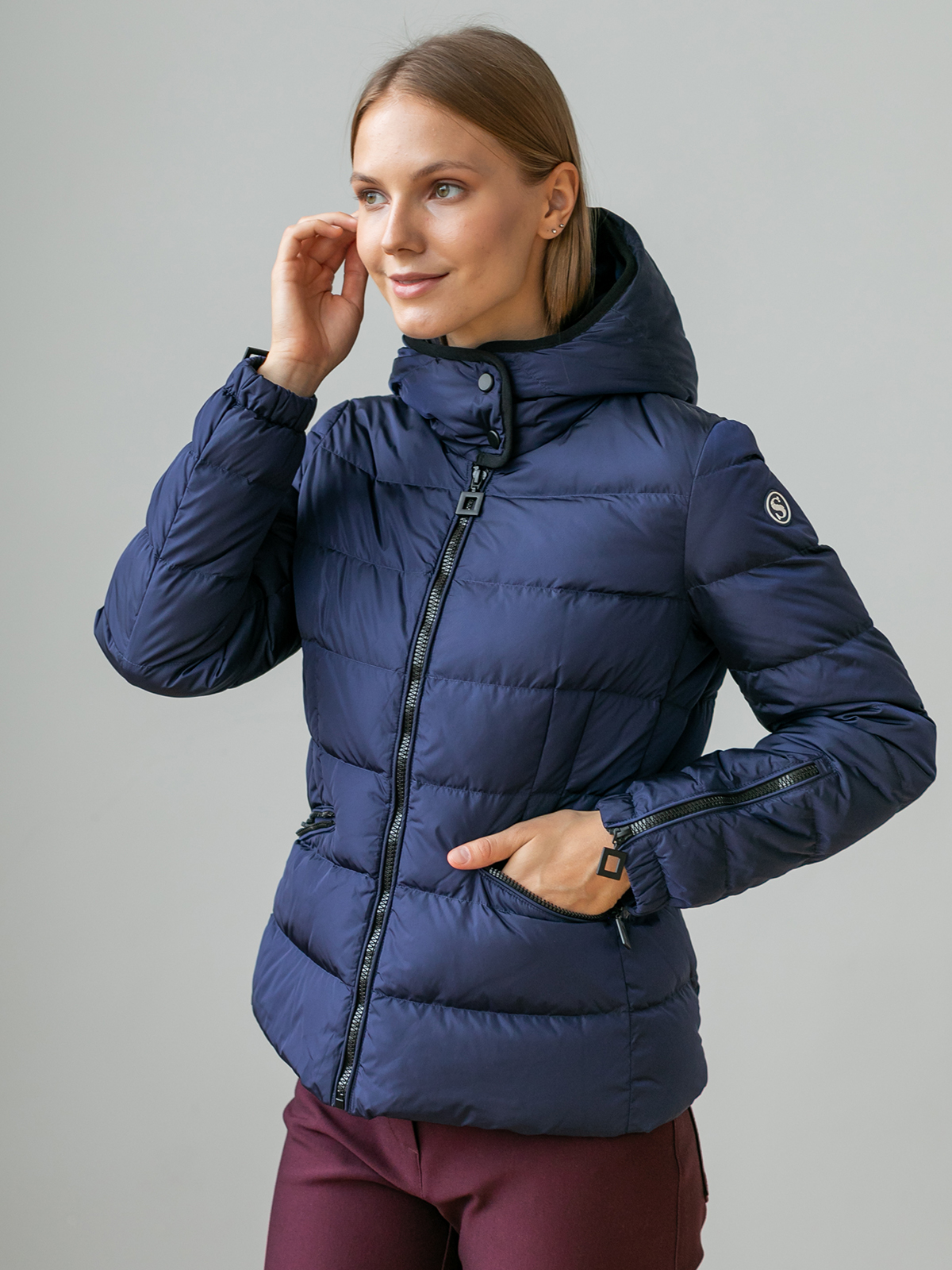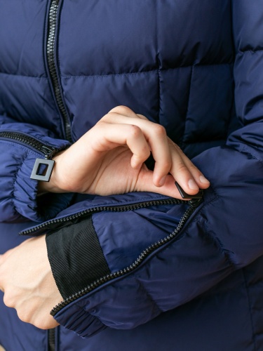 На сайте указаны российские размеры. Короткая пуховая куртка спортивного стиля. Карманы на молнии. Рукава оформлены замком-молнией. Капюшон фиксируется спереди кнопками, что позволяет защитить шею от ветра и холода.