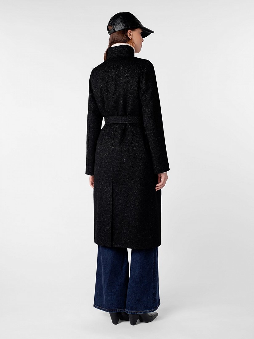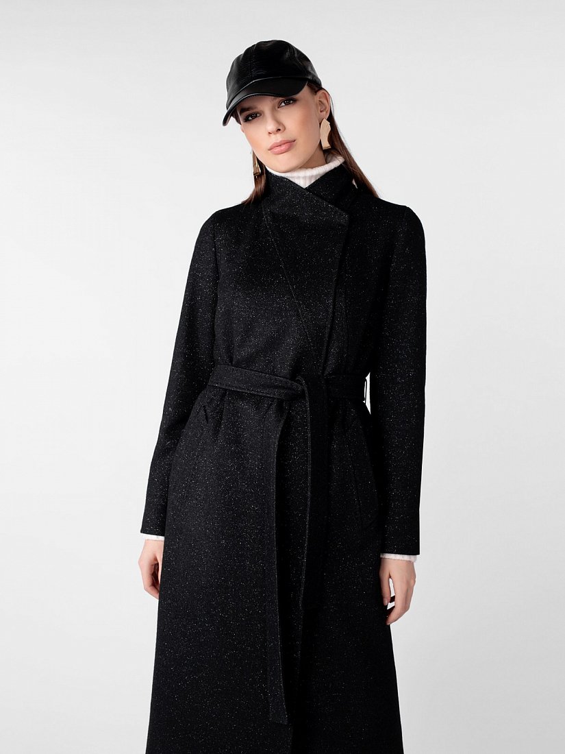 Пальто полуприлегающего силуэта длиной ниже колена. Втачной рукав, застёжка на пришивные кнопки, воротник-стойка, рельефы на полочке, карманы-листочки, пояс, шлица в среднем шве спинки. Изделие декорировано тамбурной строчкой. Произведено с ветрозащитной мембраной Raft Pro. Утепленная спинка по технологии Eurowinter. Утеплитель из биопуха DuPont Sorona. Изготовлено из шерстяного твида чёрного цвета с люрексом.