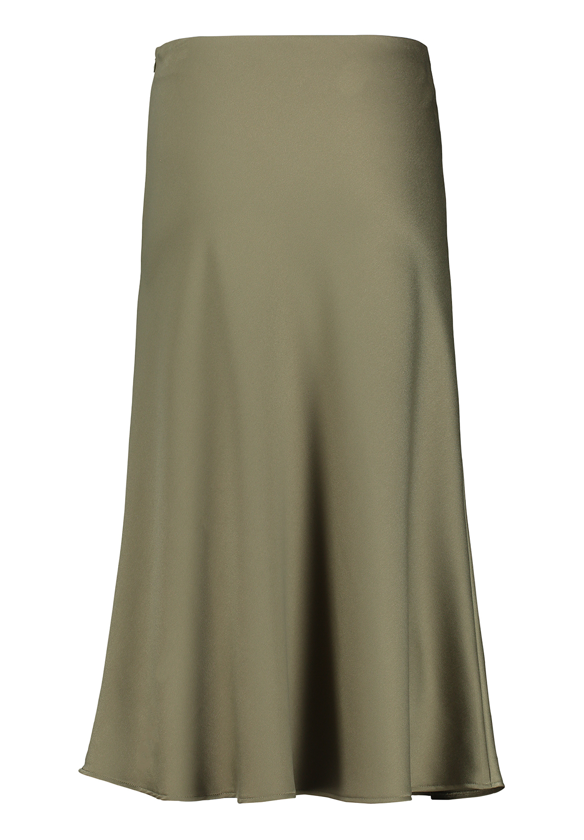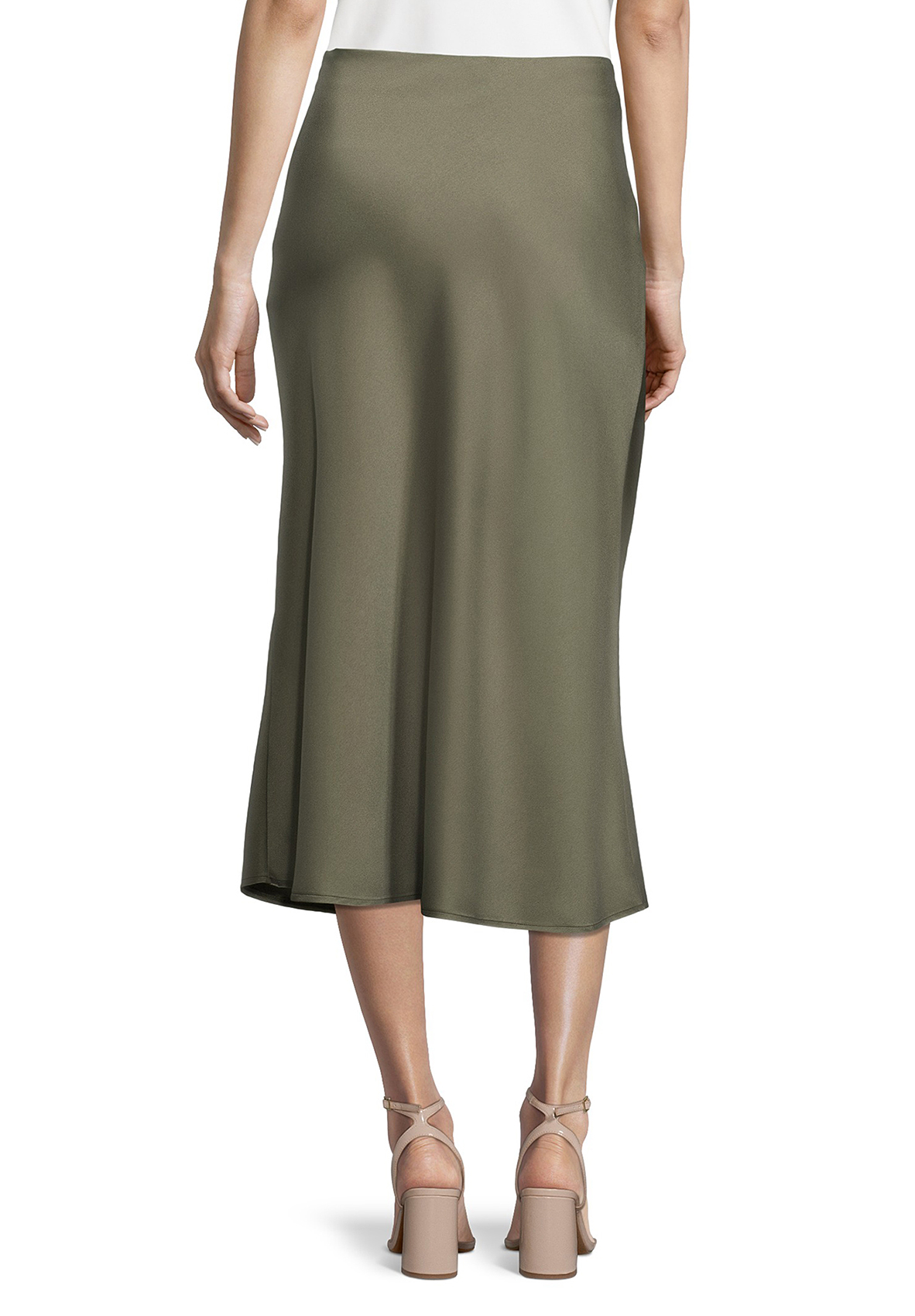 Юбка миди, облегающая в бедрах и расширяющаяся книзу - очень женственная модель. Материал юбки имеет приятный атасный блеск, создающий роскошный образ. Модель застегивается на молнию сбоку.