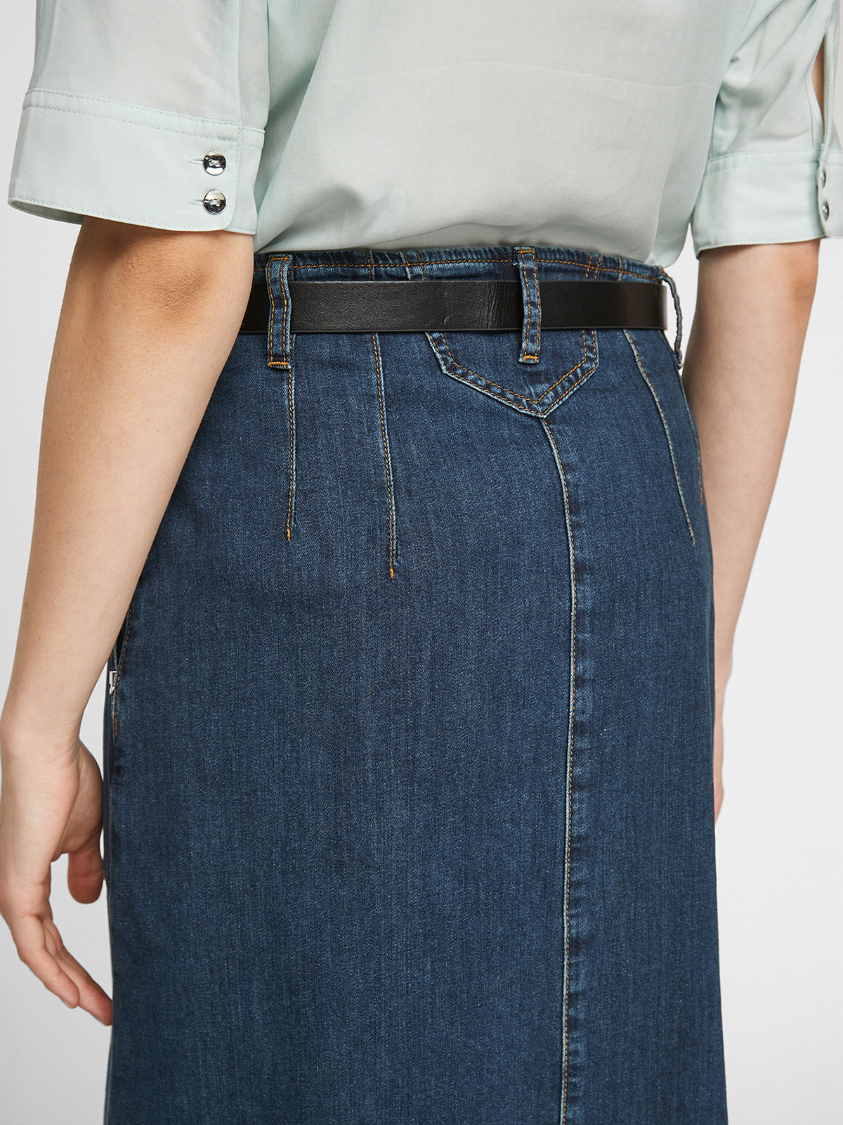 Джинсовая юбка длины миди. Прорезные боковые карманы. Пояс со шлевками, в комплекте идет ремень из экокожи.