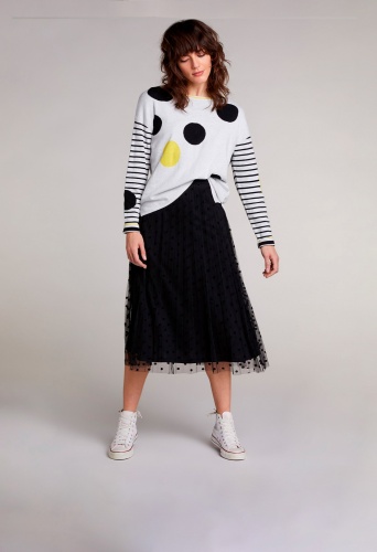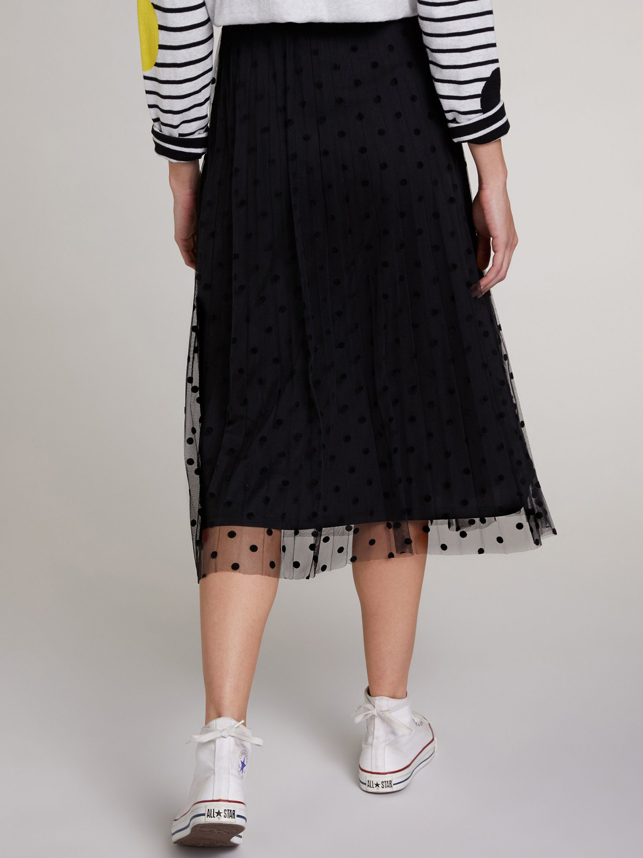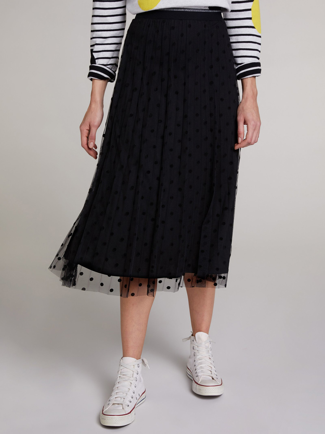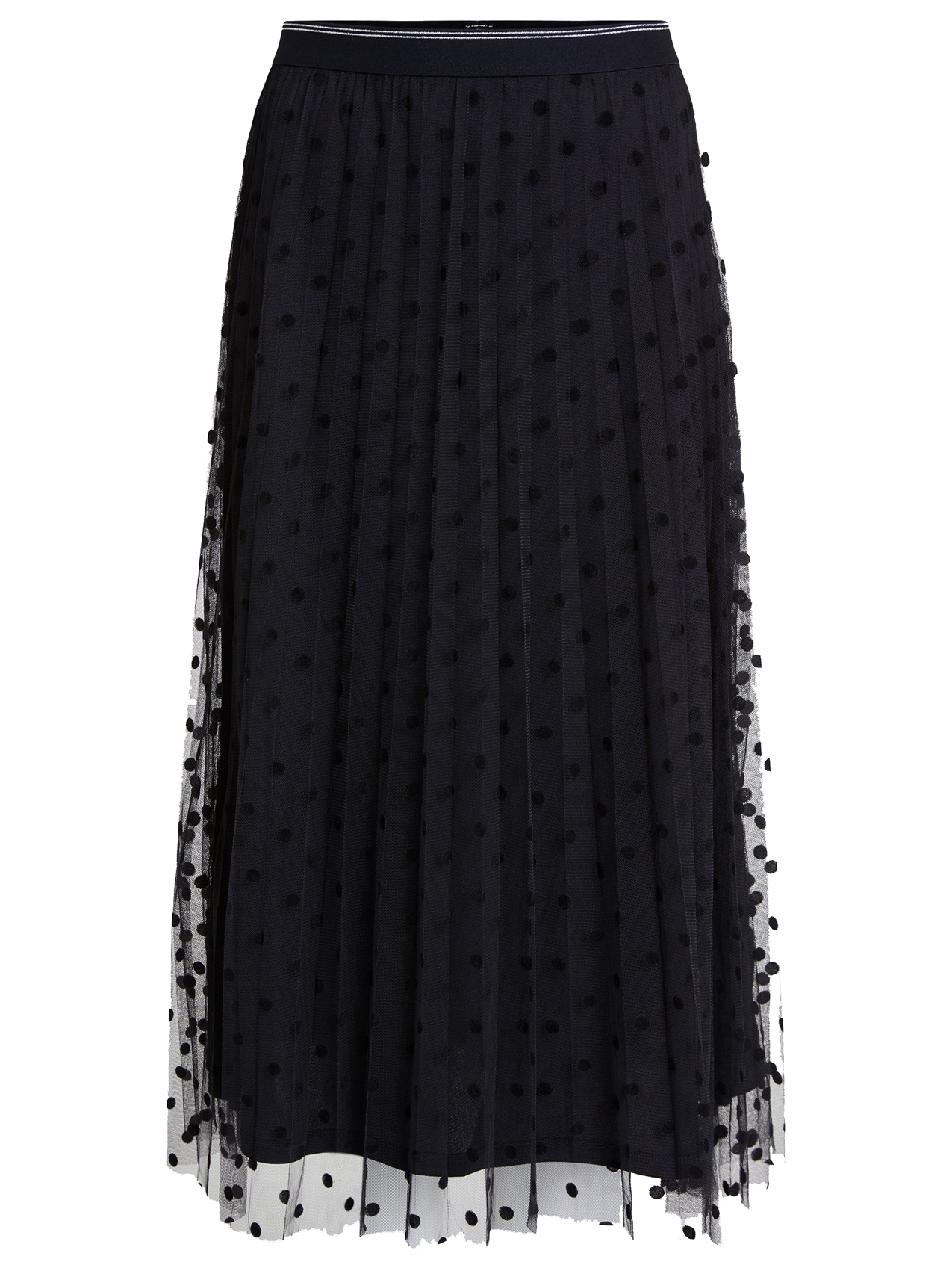 Двуслойная юбка длины миди со складками плисе. Верхний слой выполнен из сетки и украшен узором в горох. Эластичный пояс обеспечивает комфортную посадку и удобство повседневного ношения. Юбку хорошо сочетать с футболкой и кроссовками для создания повседневного образа в городском стиле.