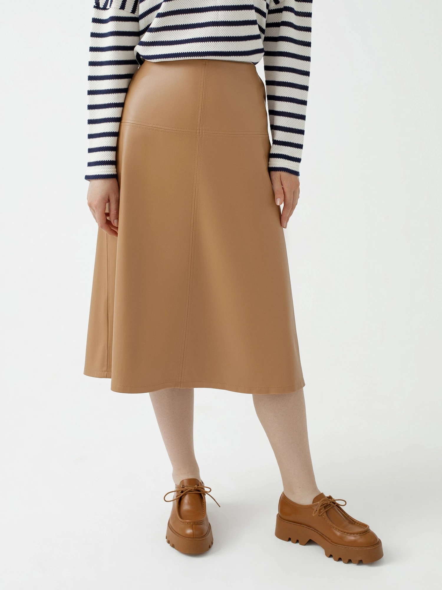 На сайте указаны Российские размеры Юбка силуэта трапеция из экокожи карамельного цвета длины миди. В боковых швах два функциональных прорезных кармана. В качестве декоративных элементов - вертикальная и горизонтальная отстрочки. Юбка послужит отличной осенней базовой вещью, которая добавит модный акцент в любой образ. Рост модели на фото - 175 см.
