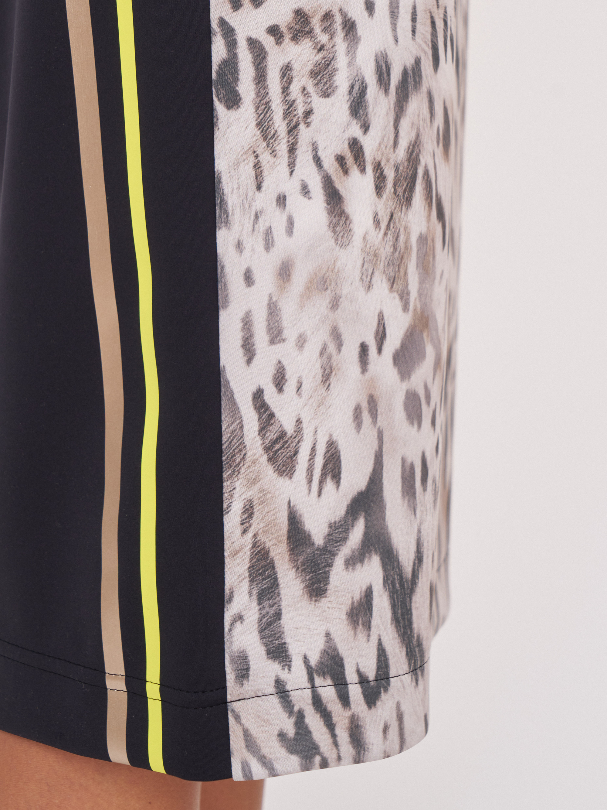 На сайте указаны российские размеры. Прямая трикотажная миди юбка на резинке с леопардовым рисунком и полосками. Длина по спинке: 60 см. Рост модели: 175 см.