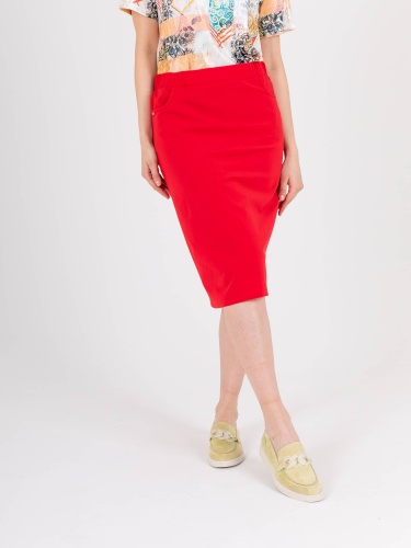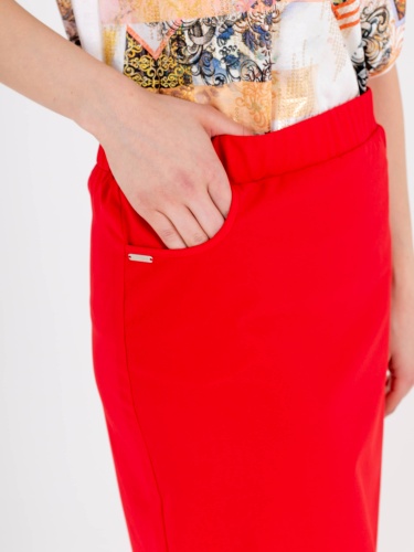 Яркая юбка-карандаш длиной ниже колена из полиэстера с добавлением мягкой вискозы и эластана. На переднем полотнище юбки расположены два кармана с отрезным бочком. Верх юбки обработан поясом на резинке.