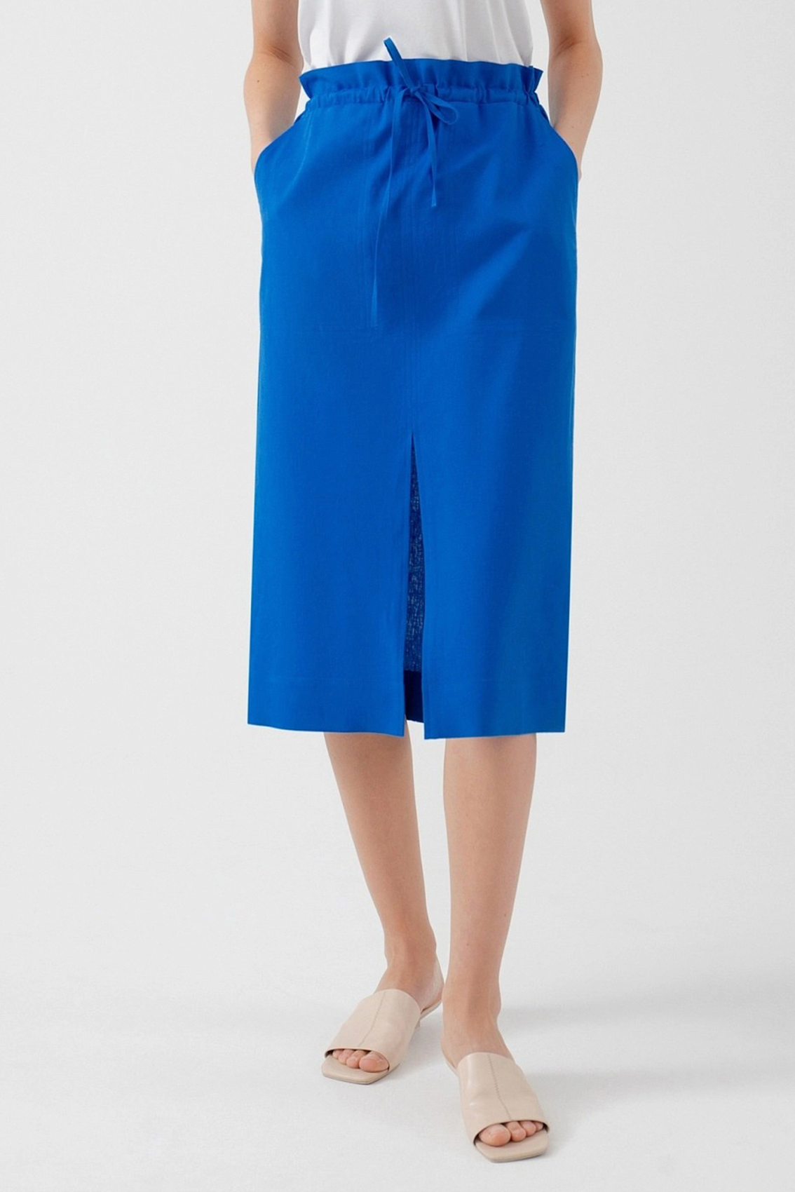 Юбка из ярко-синего хлопка, прямого силуэта, с разрезом по переду и накладными карманами. Пояс юбки на резинке с кулиской.