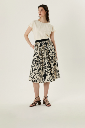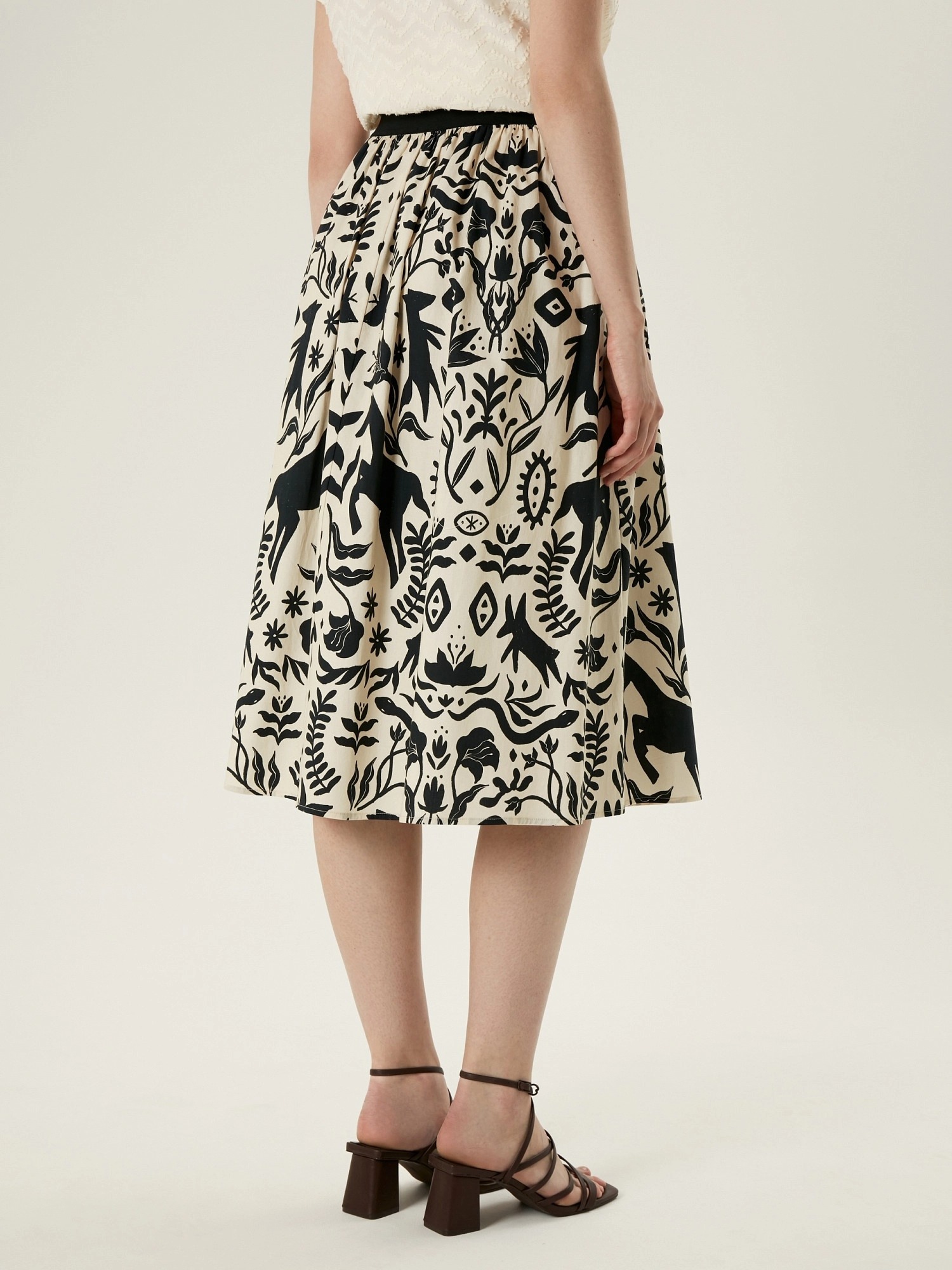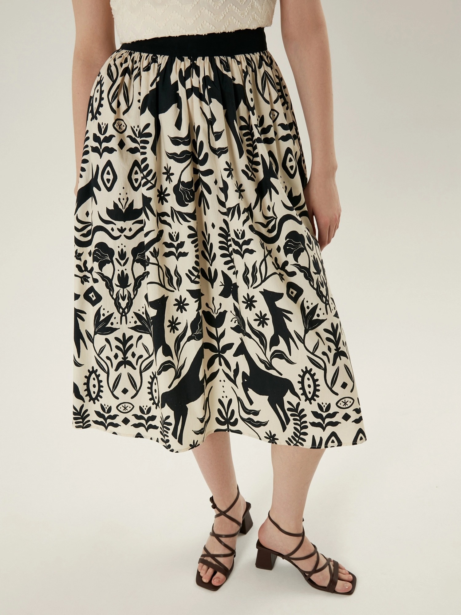 Юбка в городском стиле с крупным принтом, силуэта трапеция, длиной миди. Пояс на широкой резинке. По талии сборка. Карманы в боковых швах.