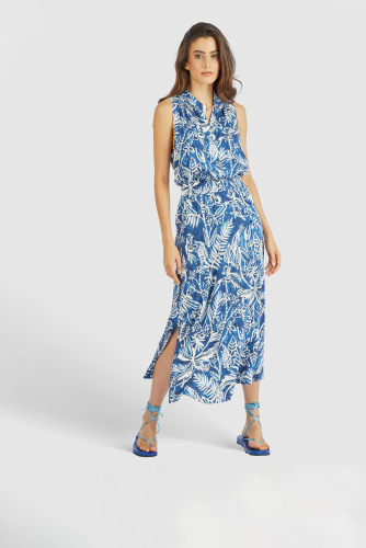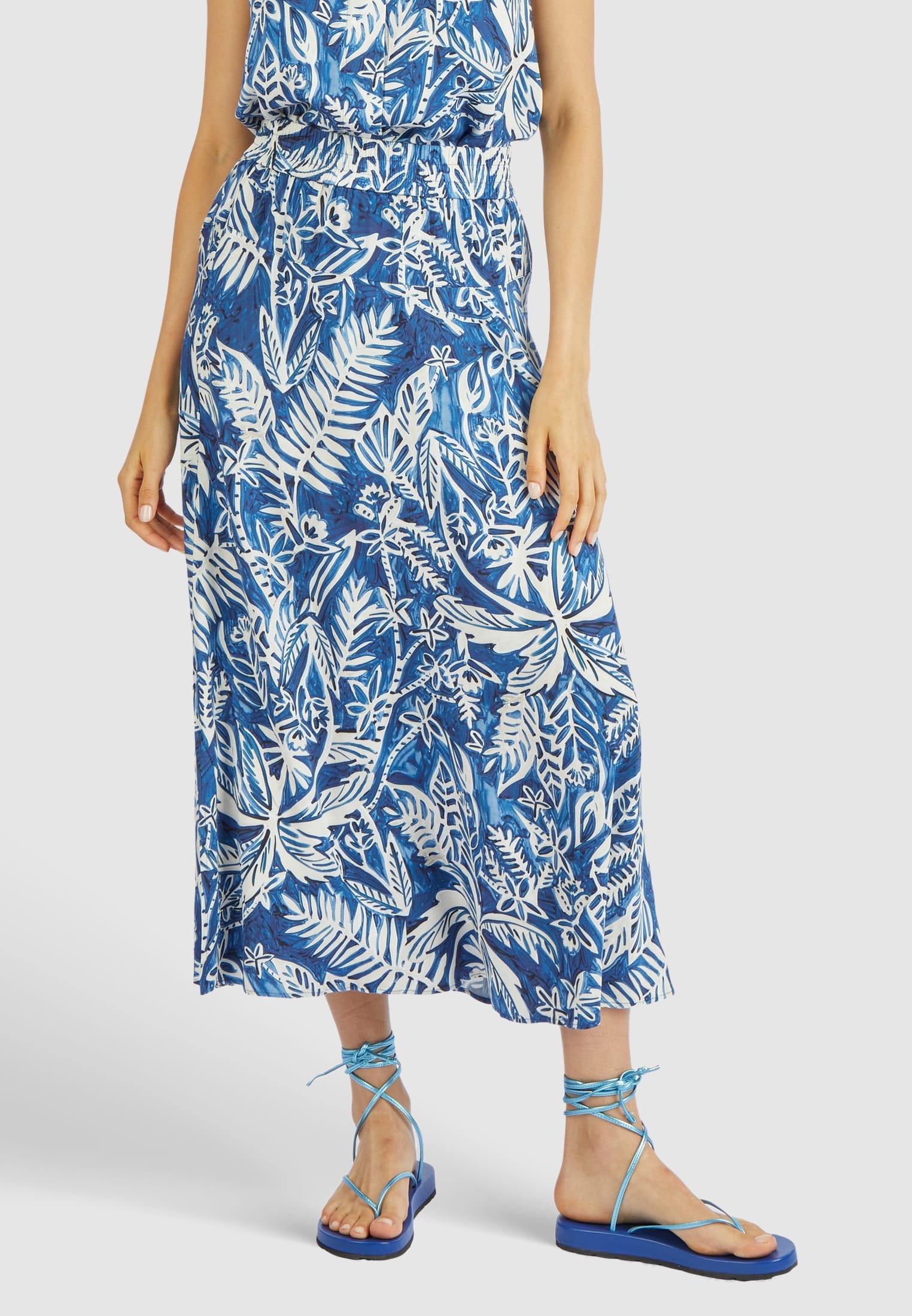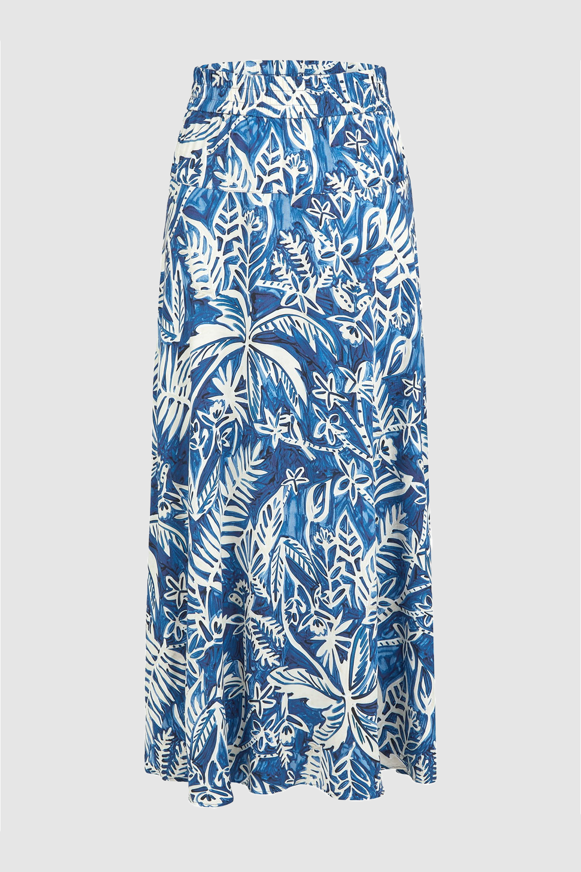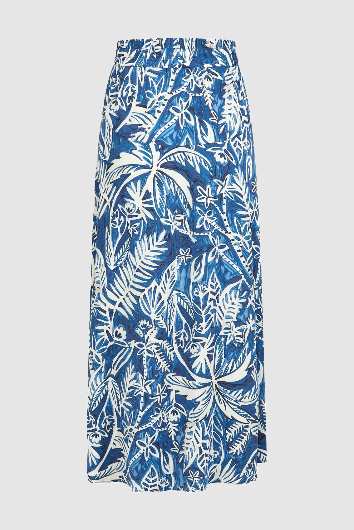 Юбка-макси с тропическим принтом изготовлена из мягкой вискозы. Разрезы в боковом шве по низу и декоративная отделка кокеткой придают образу неповторимость.