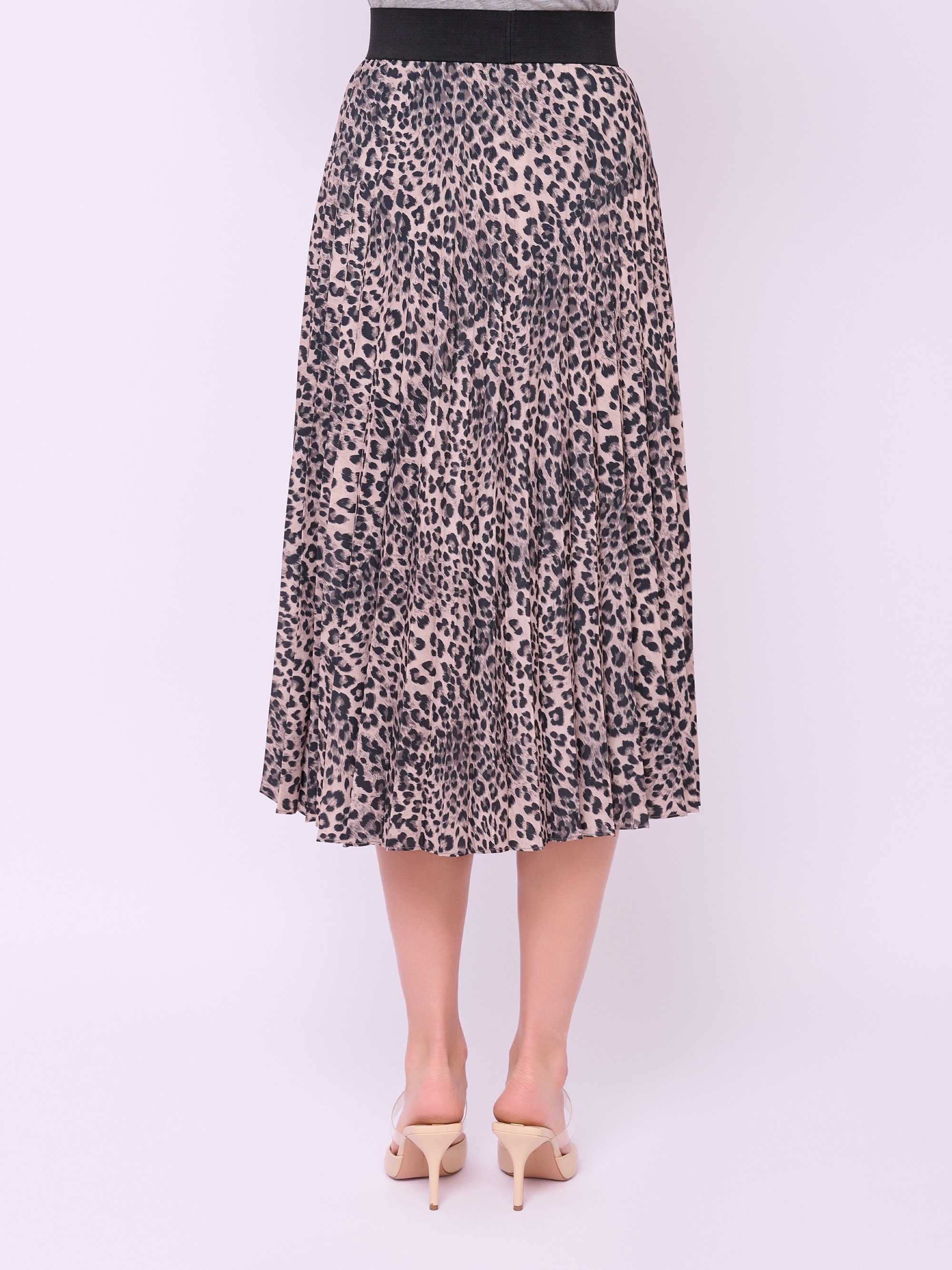 Плиссированная юбка средней длины на широкой резинке из ткани с анималистическим рисунком. Длина по спинке: 81 см.