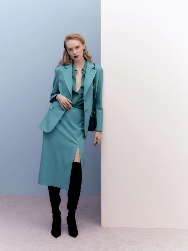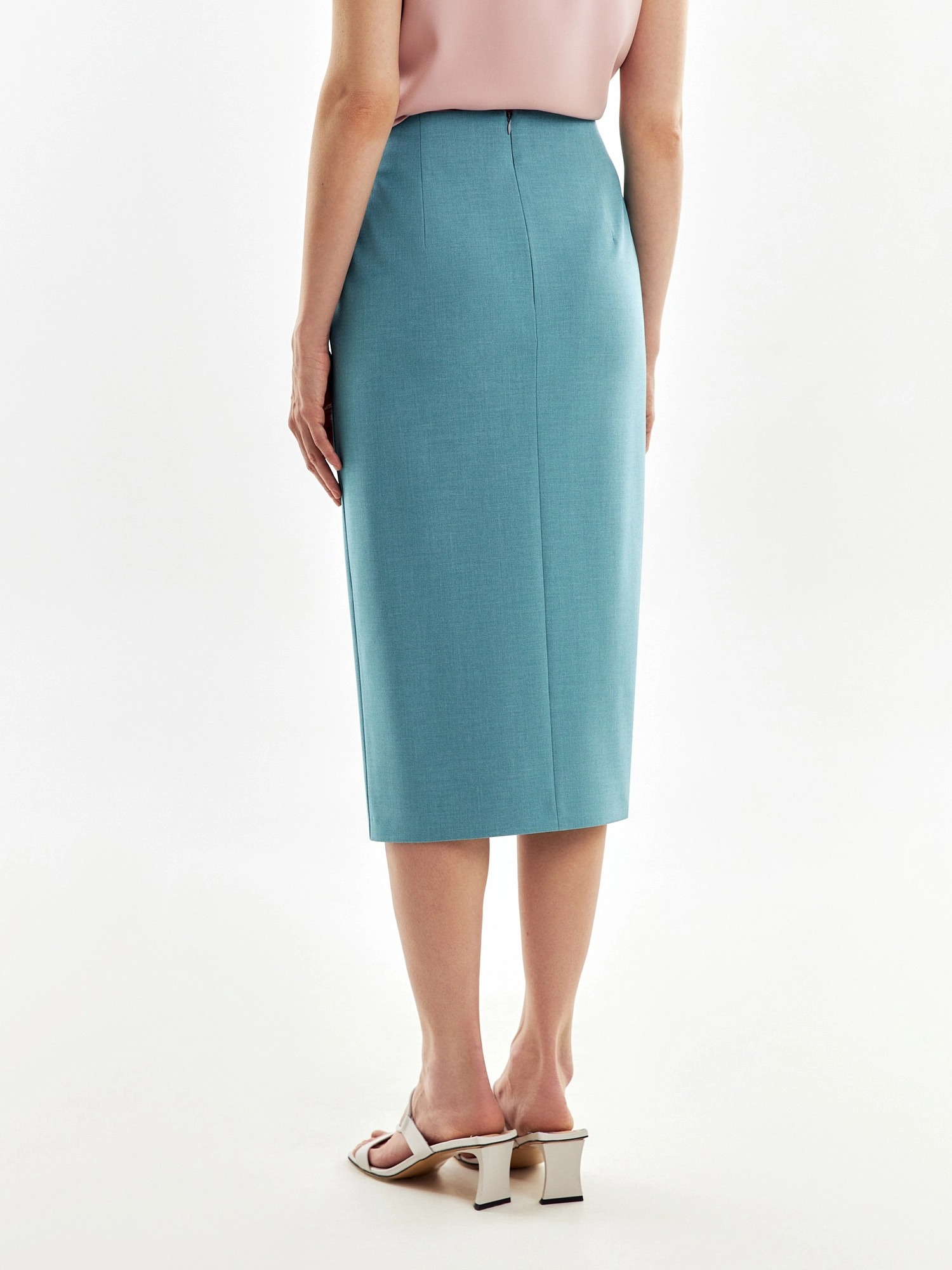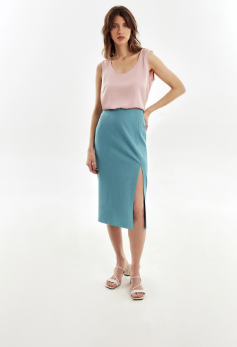 Юбка прямого силуэта из костюмной ткани бирюзового цвета. На передней части юбки два рельефа для наилучшей посадки и элегантный высокий разрез. Застежка на потайную молнию.