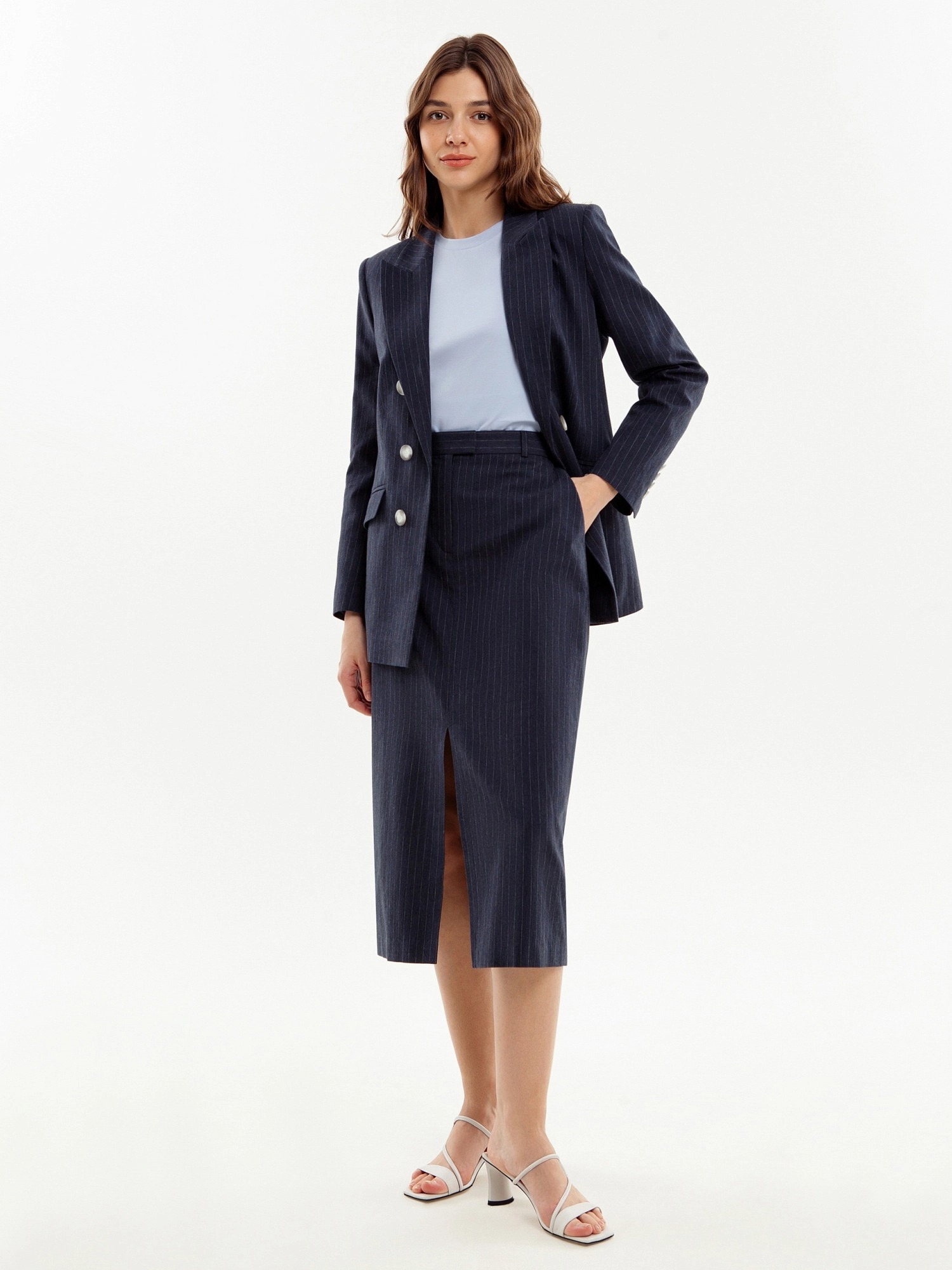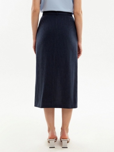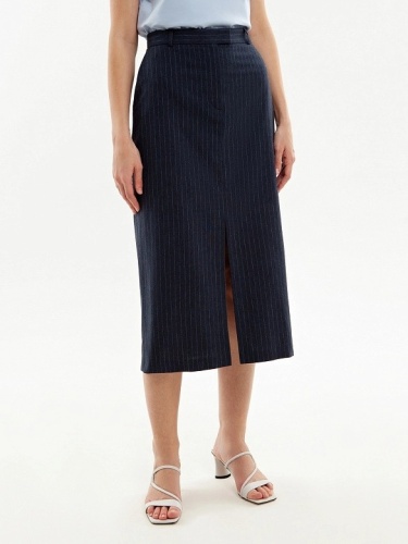 Прямая юбка длины миди, на талии с гульфиком по центру, на притачном поясе со шлевками. Разрез спереди по центру. Юбка из 100% хлопковой костюмной ткани в тонкую полоску. Рабочие карманы по бокам.